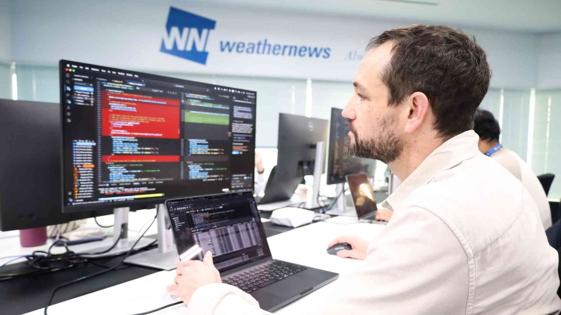 私は、日本で英語講師として働く一方で、プログラミングに興味を持ち、実践的な開発講座や関心のあるオンラインコースを学びながら、独学でスキルを身につけてきました。その過程で、勤務先のスケジュール管理や労働時間の計算を自動化する簡易的なシステムを開発するなど、実務に近い形で開発経験を積んできました。そうした経験を経て、現在はディベロッパーとしてウェザーニューズに入社し、海運向けサービスのフロントエンド開発に携わっておよそ5年になります。