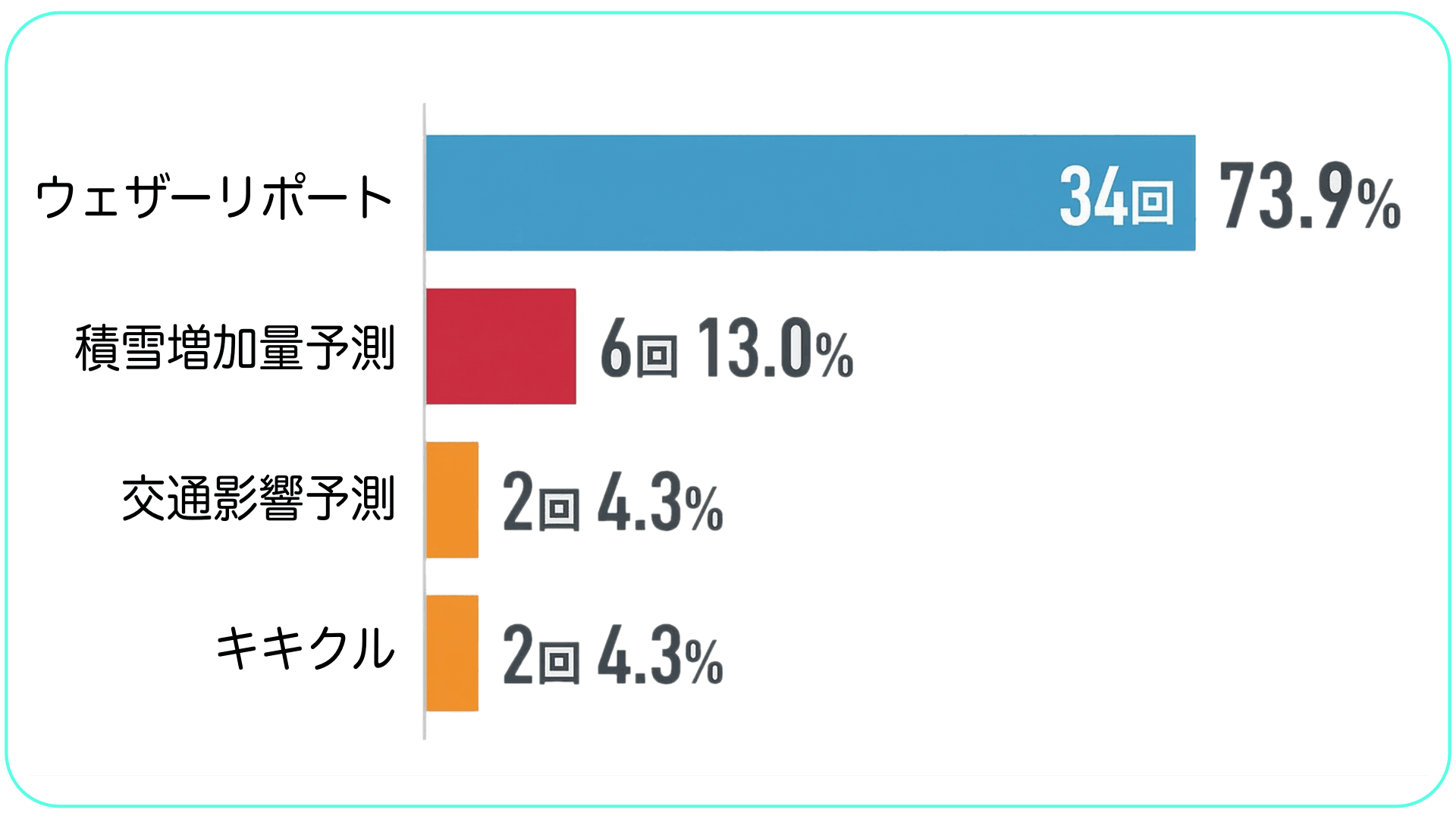 こちらの画像は、とあるテレビ番組における「ウェザーニュース for business」の活用回数をコンテンツごとにまとめたものです。ご覧の通り、圧倒的に活用されているのは「ウェザーリポート」でした。 これらの情報はいつしか、報道のプロも認める「品質の高い情報」として、ニュースに欠かせない存在となっていたのです。
