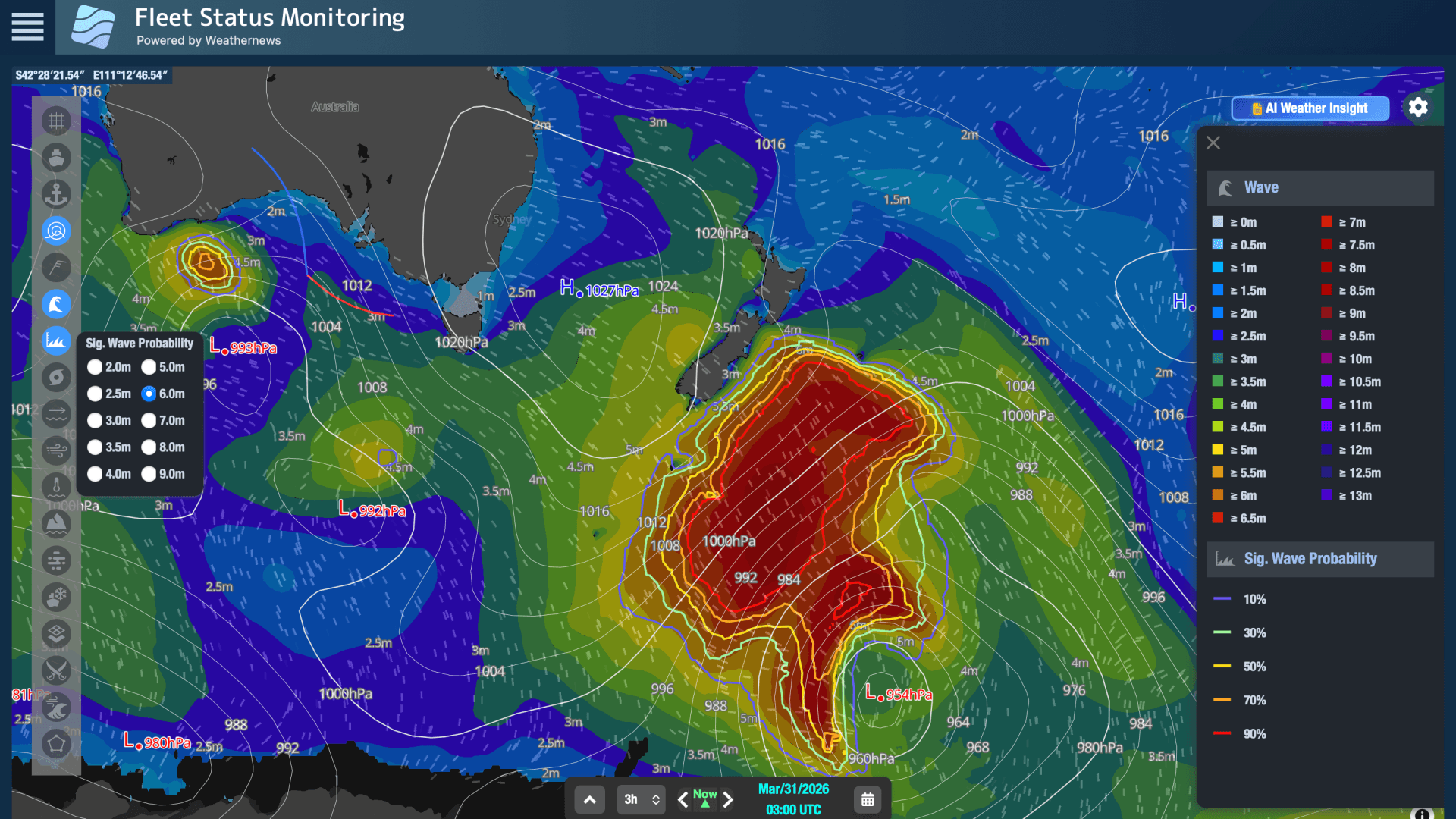 また、弊社のプラットフォーム「SeaNavigator」では、従来の「明日の波は6m」という波高予測に加えて、6mの波高を超える可能性を示した「航行リスク(Wave Probability)」をみることができます。