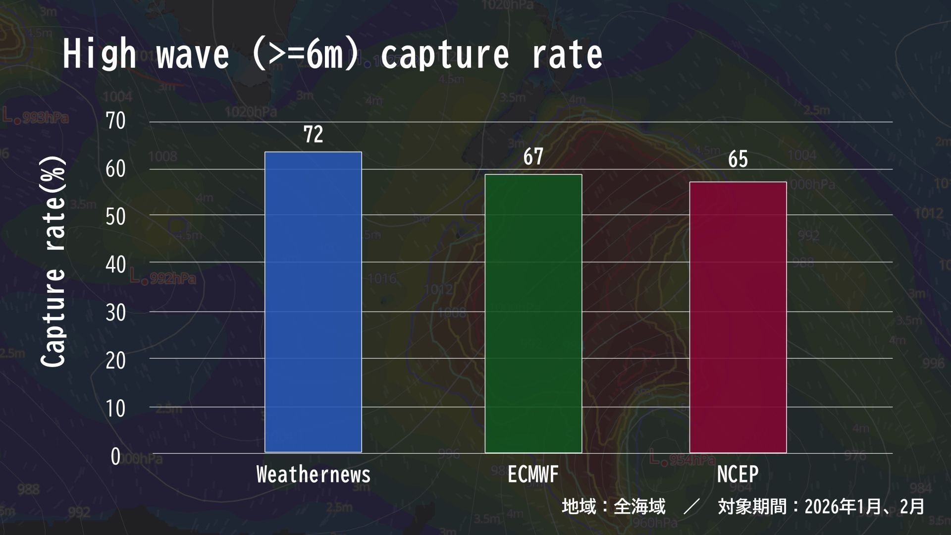 評価の結果、ECMWFやNCEPよりも、6m以上の高い波高を捕捉できる割合が高いことがわかりました。