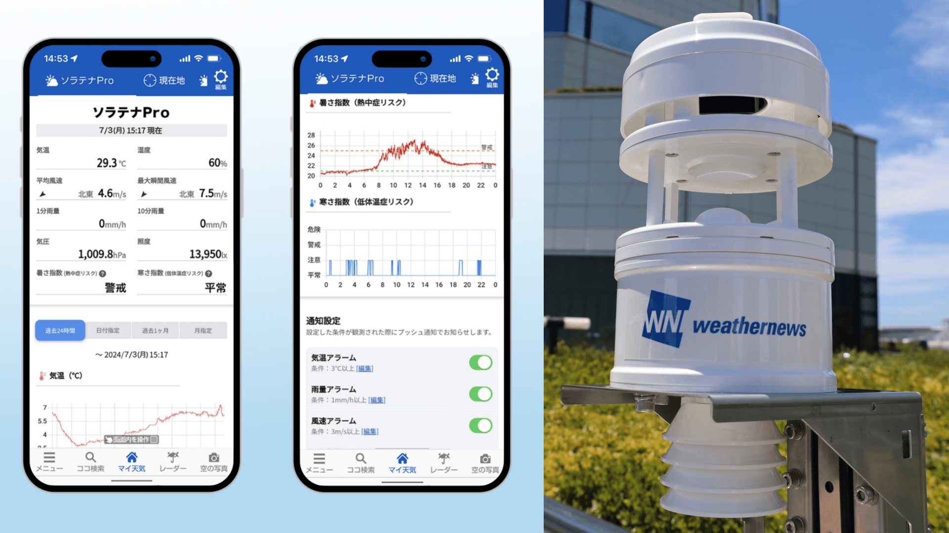 ウェザーニューズではソラテナProを活用して、設置場所のWBGTを1分単位で算出することが可能です。
