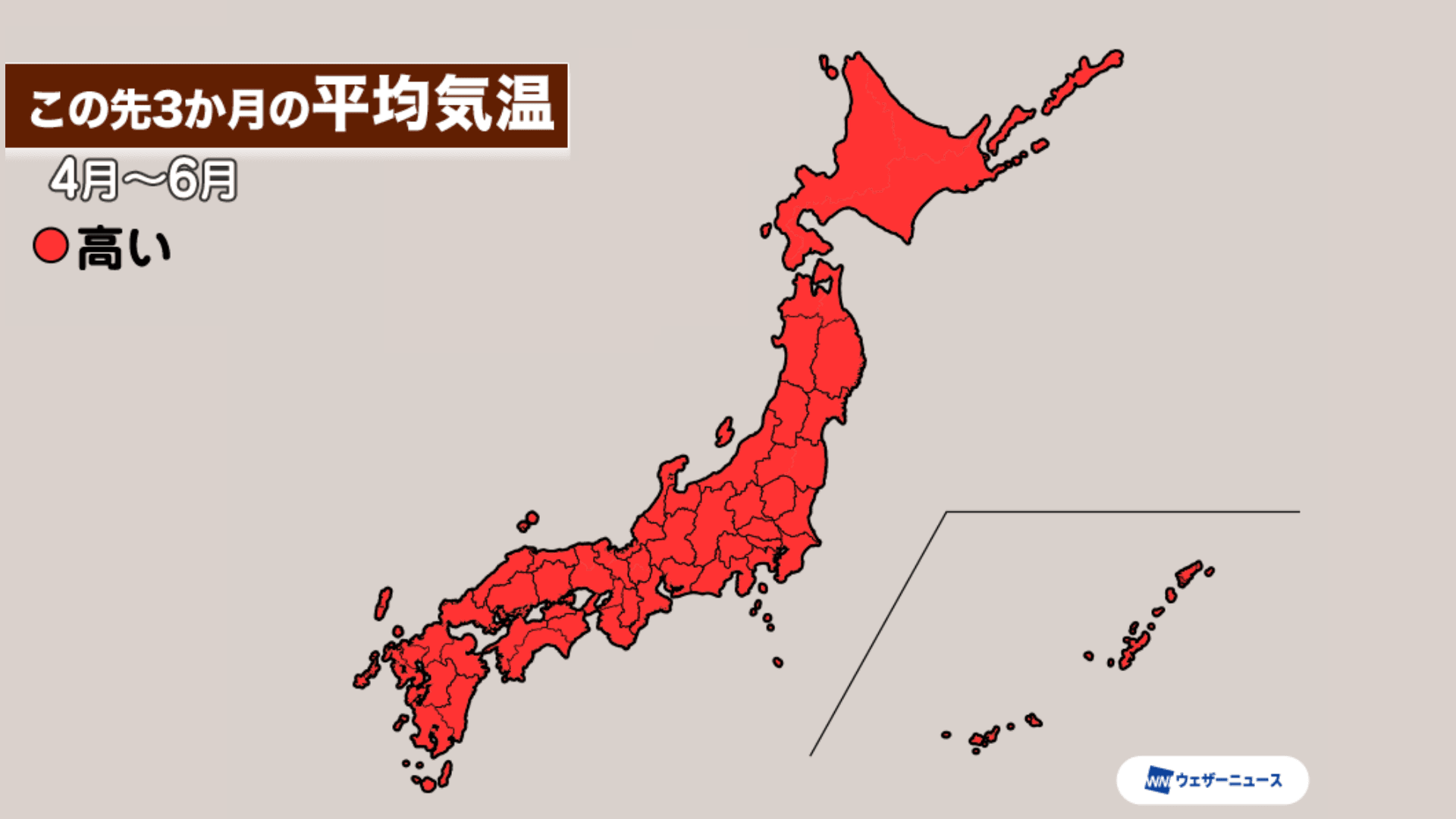3月24日(火)に気象庁は4月から6月までの3か月予報を発表しました。 日本列島は暖かい空気に覆われやすく、気温は全国的に平年より高くなる予想です。 早めの暑さ対策を心がけ、熱中症にもご注意ください。