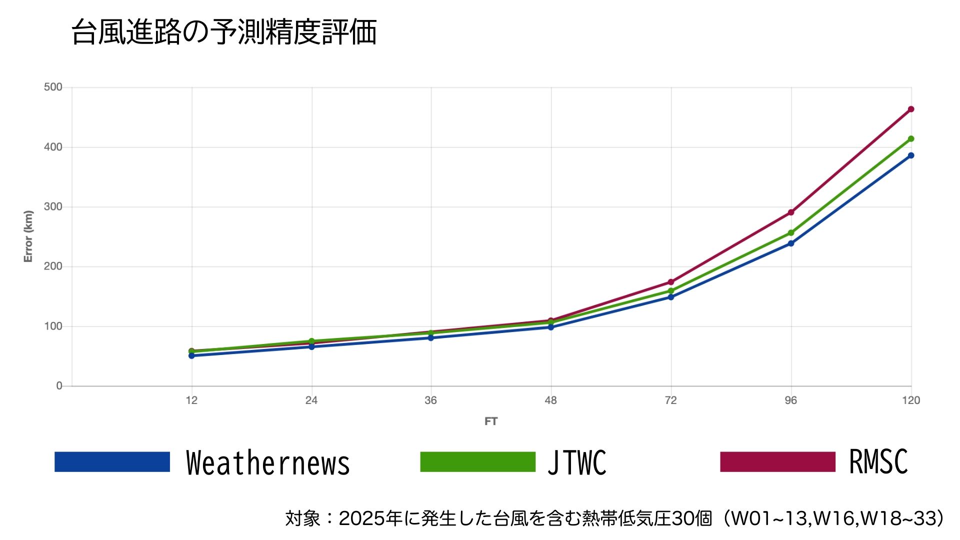 ・2025年に発生した全台風を対象に、気象庁、JTWC、ウェザーニューズの3機関の進路誤差を独自に比較。