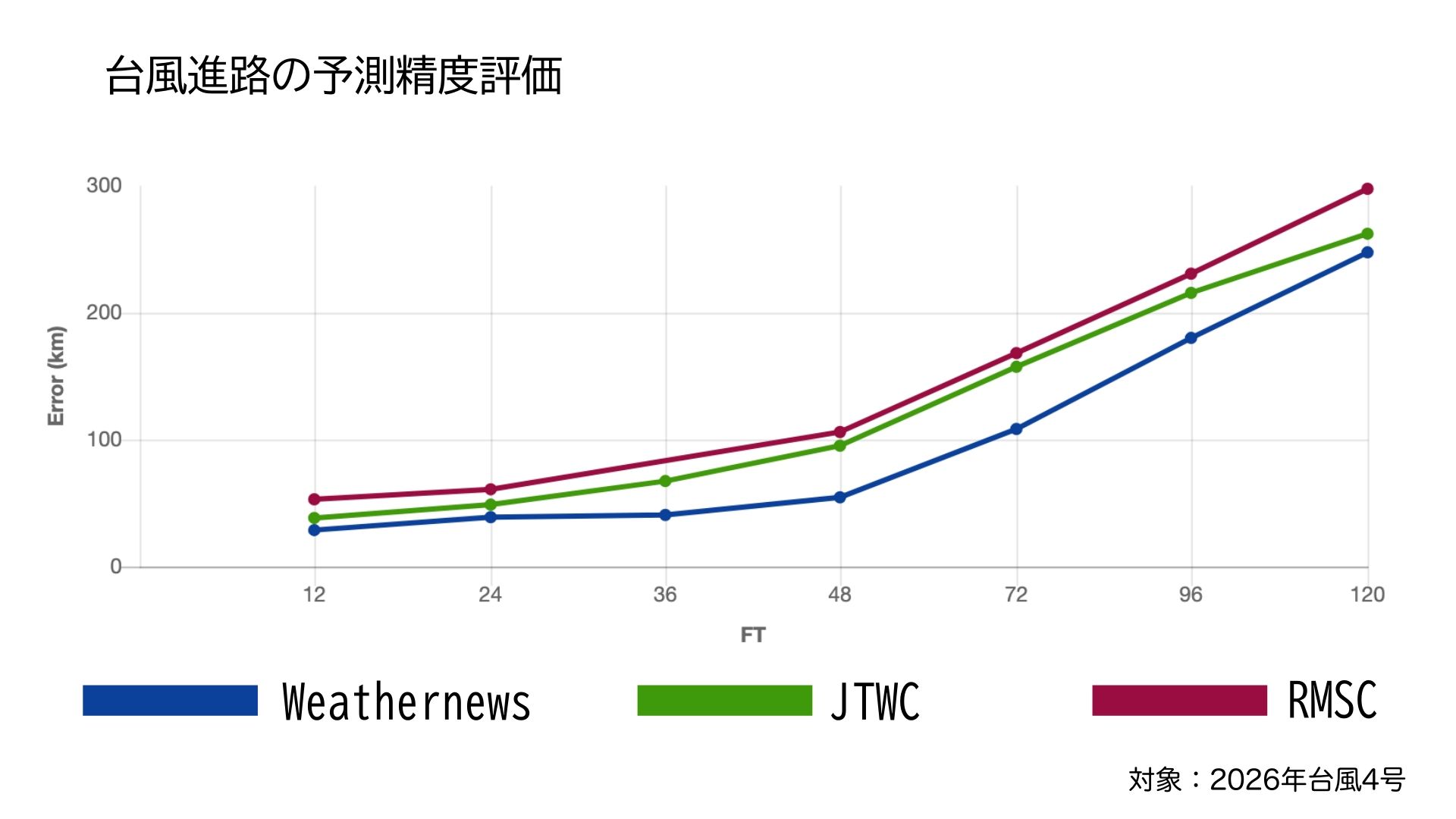 なお、2026年4月10日に発生した台風4号(シンラコウ)の予測精度評価を実施したところ、以下のように他機関と比べて精度が高かったことがわかりました。