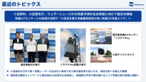 小笠原村と小笠原支庁、およびウェザーニューズがこの間、協定式を結びました。小笠原というのは東京都なんですが、実は雨雲レーダーが設置されてないんです。かなり多く雨も降るんですが気象予測における雨の捕捉率が非常に弱いという点がありまして、我々はそこに対して我々のSoratenaProという小型の観測機や、あるいは小型のライブカメラを設置することで、この小笠原が最も気象観測密度が高い気象DXの先進エリアにしていこうというプロジェクトを立ち上げております。