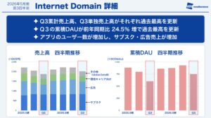 続きましてInternet Domainですが、こちらQ3売上単独も過去最高でした。前年のQ3と比べるとDAU、デイリーアクティブユーザーがしっかりと増加し、売上に関しても広告売上の部分がしっかり増収している構造です。ある程度天気に左右される部分もあるのですが、Q3においては(DAUも)しっかり戻ってきたと捉えております。