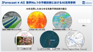 続きまして、予報です。こちらも本当にたくさんあるので紹介出来るのはごく一部ですが、例えば最近はAIが台風を予測します。この件はコーポレートブログで詳細を書いておりますが、今はAI予測モデルの方がどの気象機関の物理モデルよりも当たるという結果が出ています。そういったものをいち早く利用して、我々のサービスに役立てております。