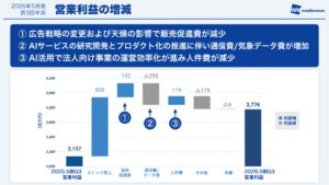 続いて、営業利益の増減についてです。ポイントは三つあります。まず一つ目は広告戦略の変更を背景としておりますが、もっと効率的に広告を出して獲得していくというところで利益を押し上げる形になっています。また、AIに関してもしっかり投資していく方針に基づきデータ費・通信費が増加し、引き続き投資フェーズとなっています。一方、AI活用が人件費の減少という形で数値に出ており、運営の効率化が進んでおります。これもまた利益を押し上げる要素になっています。