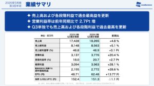 業績のサマリーといたしましては、売上高、そして各段階利益全てにおいて過去最高を更新いたしました。営業利益率も2.7%増というところで、中計において利益体質になるという目標を掲げ、営業利益率の成長にも注視しておりますが、20%以上という目標に対してすでに20.7%という形でしっかりと進捗しております。なお、Q3単独の業績についても、各段階で過去最高という形になっております。