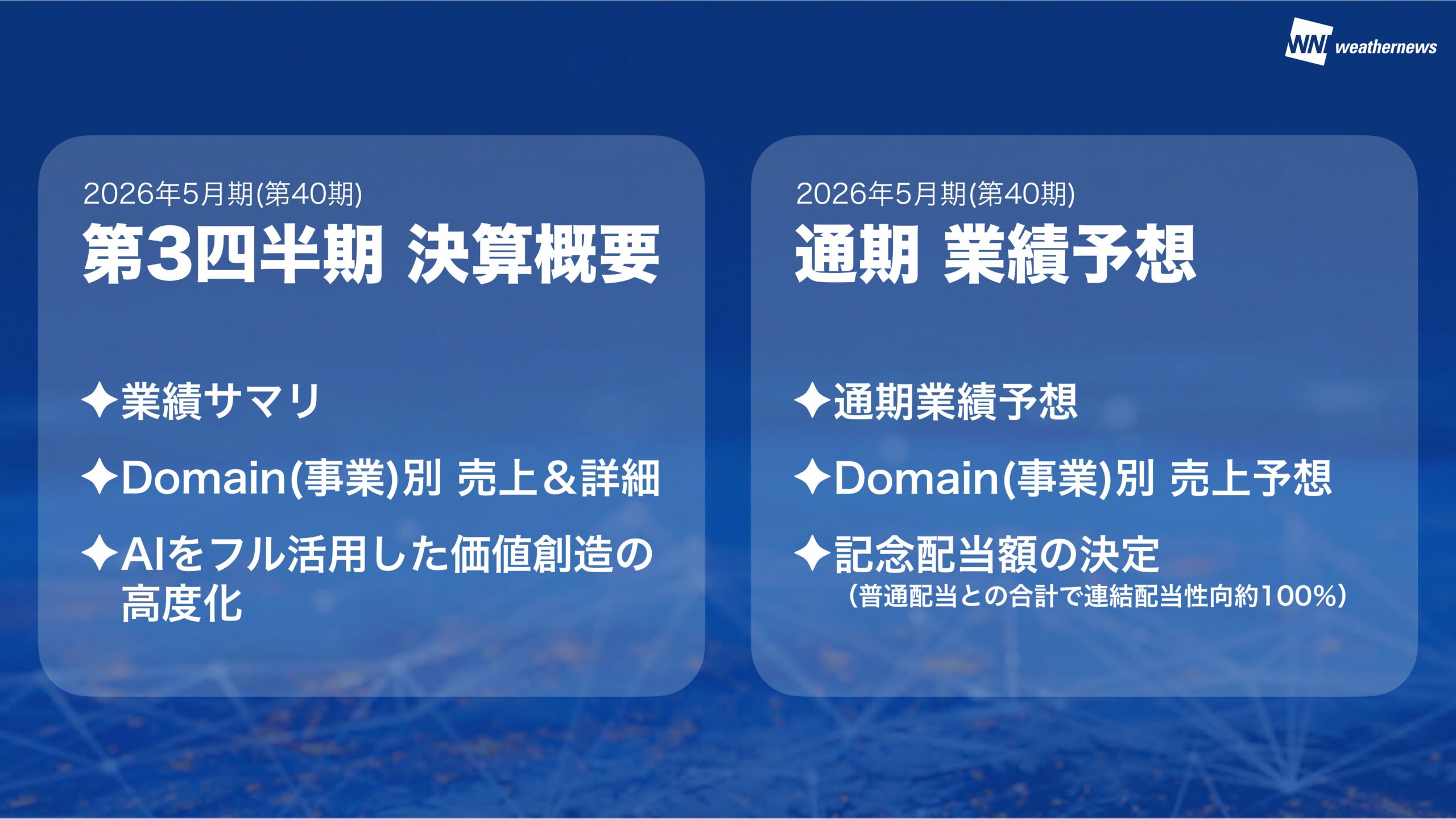 また、放送局様に今使っていただいているウェザーニュース for businessの放送パックという、for businessのPC画面に出ているウェザーリポート、もちろん我々の方で中身を確認したものですが、それをそのままオンエアに使っていただけるサービスです。放送市場向けについてこのようにゲームチェンジしている部分もあり、Q3でこのあたりで大きく進捗がありました。