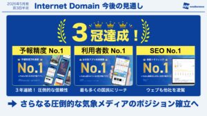 こちらは前回の決算資料にも掲載しておりますが、予報精度No.1、利用者数No.1、SEONo.1という形で主要な項目すべてに対してNo.1を取っております。