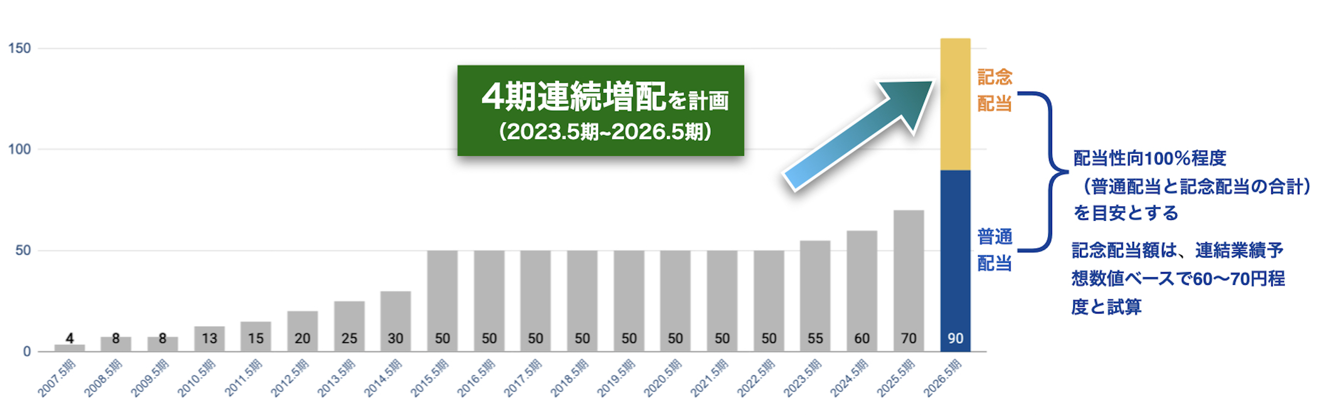 (※)記念配当額は、連結業績予想数値ベースで60~70円程度と試算。