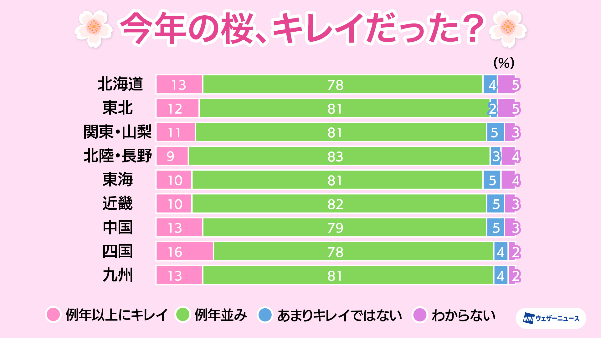 今年の桜の美しさについて、ウェザーニュースアプリのユーザーに「今年の桜はキレイだった?」と質問し、“例年以上にキレイ”“例年並み”“あまりキレイではない”“わからない”の4択で回答していただきました。回答を集計した結果、“例年並み”と回答した方が最も多く、全国平均で81%となりました。