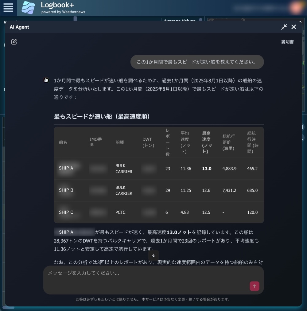 「AI Weather Insight」は、AIを用いて5日先までの全世界の海域における気象・海象見解をテキストや表で自動生成するほか、船舶の位置や航路情報をもとに、荒天影響船をピックアップし、波・風の予報や影響時間を瞬時に算出します。荒天時でも常にリアルタイムの予報を確認できるため、より安全なルート選定や遅延リスクなどの把握が可能になります。「AI Agent」はテキストで質問するだけで、過去の海象データやお客様の船舶の位置情報や船舶性能などのデータにアクセスして分析し、チャット形式(対話形式)で回答します。例えば、「この3か月で燃費が良くて、スピードも出る船舶は?」のように、人手では時間がかかる内容もAIによって瞬時に分析できるため、船舶性能の業務解析の迅速化が実現します。