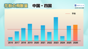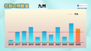 2026年春の花粉飛散量は北日本と東日本で2025年を大きく上回る一方、西日本では前年並となる予想です。北海道や東北北部、北陸や甲信では2025年の飛散量が少なかったため2025年比で200%を超える地域が多く、秋田県では600%を超える予想です。東北北部では過去10年で最多の飛散量かそれに匹敵する飛散量になるおそれがあります。西日本では近畿や中国・四国の太平洋側で2025年を上回るエリアが多くなる一方、2025年に記録的な大量飛散となった九州北部では半減する地域もあるとみています。全国平均では2025年比で134%となる予想です。