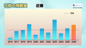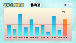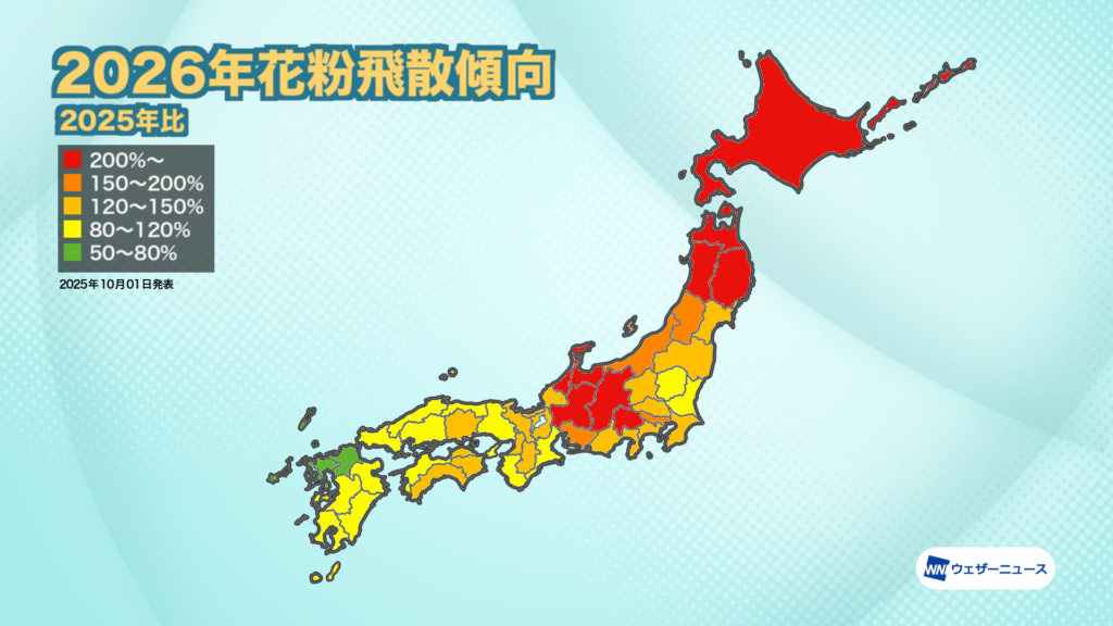モバイル/インターネット >株式会社ウェザーニューズ(本社:千葉市美浜区、代表取締役社長:石橋 知博)は、2026年春の花粉シーズンに向け、「第一回花粉飛散予想」(スギ・ヒノキ、北海道はシラカバ)を発表しました。2026年春の花粉の飛散量は北日本と東日本で2025年を大きく上回り、特に東北北部では過去10年で最も多いか、それに匹敵する飛散量になる予想です。一方、西日本では前年並となる予想です。