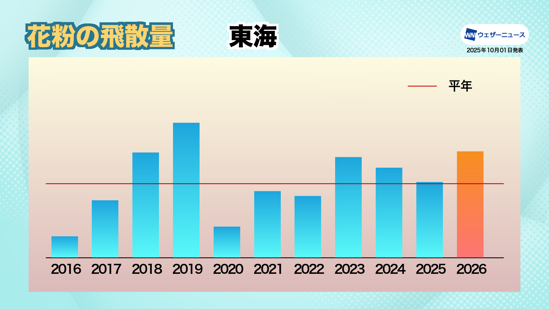 花粉の飛散量は前年夏の天候と年ごとの飛散量の増減傾向をもとに予想しています。今年の夏は広範囲で平年より日照時間が多く、全国的に気温がかなり高かったため、花粉の発生源となる雄花の生長に適した天候となりました。このため、飛散量が多くなる「表年」傾向の北日本や北陸、甲信では、前年比で大幅に飛散量が増えて、大量飛散となるおそれがあります。例年以上の万全な対策が必要です。また、飛散量が少なくなる「裏年」傾向の西日本でも平年を上回る飛散量を予想しているため、油断せずに対策をしっかりと行ってください。