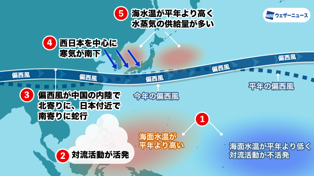 今冬は半ばまでは、太平洋熱帯域の海面水温が中部から東部で平年より低く、西部で平年より高くなる予想です(①)。この影響で、東南アジア付近で対流活動が平年より活発になり(②)、偏西風が中国の内陸で北に蛇行し、この下流にあたる日本付近では南に蛇行します(③)。このため、日本付近は西日本を中心に寒気が南下しやすくなる見込みです(④)。今シーズン中は日本海や日本の東を中心に海面水温が平年より高く、水蒸気の供給が多くなる予想です(⑤)。これらのことから、降雪量は西日本日本海側では平年並か多くなる見込みです。交通機関に大きな影響が出る可能性があるため、最新の気象情報や交通情報を随時ご確認いただき、事前の備えをお願いします。