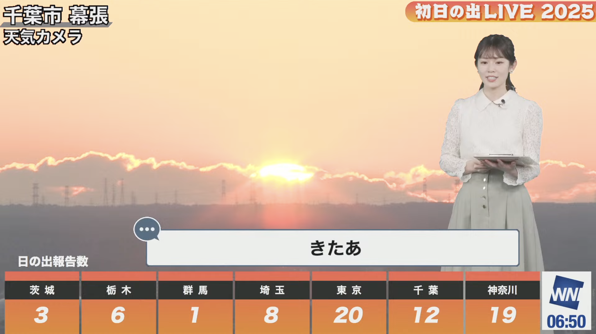 24時間生放送の気象情報番組「ウェザーニュースLiVE」では、2026年1月1日に各地の初日の出の様子を生配信します。番組では、ウェザーニューズの予報センターからの最新の天気解説を交えながら、2026年の幕開けを飾る初日の出を、日本で一番早い初日の出が見られる(※2)千葉県銚子市犬吠埼など国内6か所から生中継でお届けする予定です(天気などの関係で中継先や地点数が変更になる可能性があります)。また、番組の視聴者やウェザーニュースのユーザーの皆さんから寄せられる写真付きの投稿で、全国各地の初日の出の様子をリアルタイムで追っていきます。