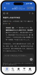 当社では、今回の全ユーザーへの無料開放を機に、お天気エージェントのさらなるアップデートを予定しています。豊富なデータを活用し、回答できる情報を充実させていくほか、ユーザーの一人ひとりによりパーソナライズされた提案を行う機能の強化など、生成AIならではのサービスとして進化を加速させていきます。当社は今後も、最先端のIT技術を駆使し、世界で最も信頼される気象情報の提供を目指すとともに、生活をより豊かに楽しむための情報発信を実現してまいります。
