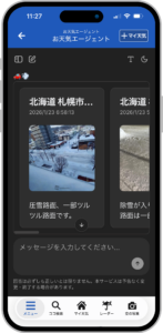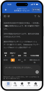 全国から届く毎日数万件のユーザー投稿(ウェザーリポート)をAIが解析。例えば、「今の新宿の様子は?」と質問すると、AIが周辺の最新投稿を要約し、「雨は止んでいるが路面は濡れている」といった、数値データだけでは見えない、「現地の生の情報」を伝えます。