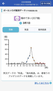 『花粉飛散情報』では、花粉(スギ・ヒノキ・シラカバ)の飛散予報が 1 時間ごと・3 時間ごとの時系列と、1 週間先まで確認できます。全国約 1,000 か所に設置している IoT 花粉観測機「ポールンロボ」の最寄りの観測データも表示し、今どれだけの花粉が飛んでいるのかリアルタイムでわかります。