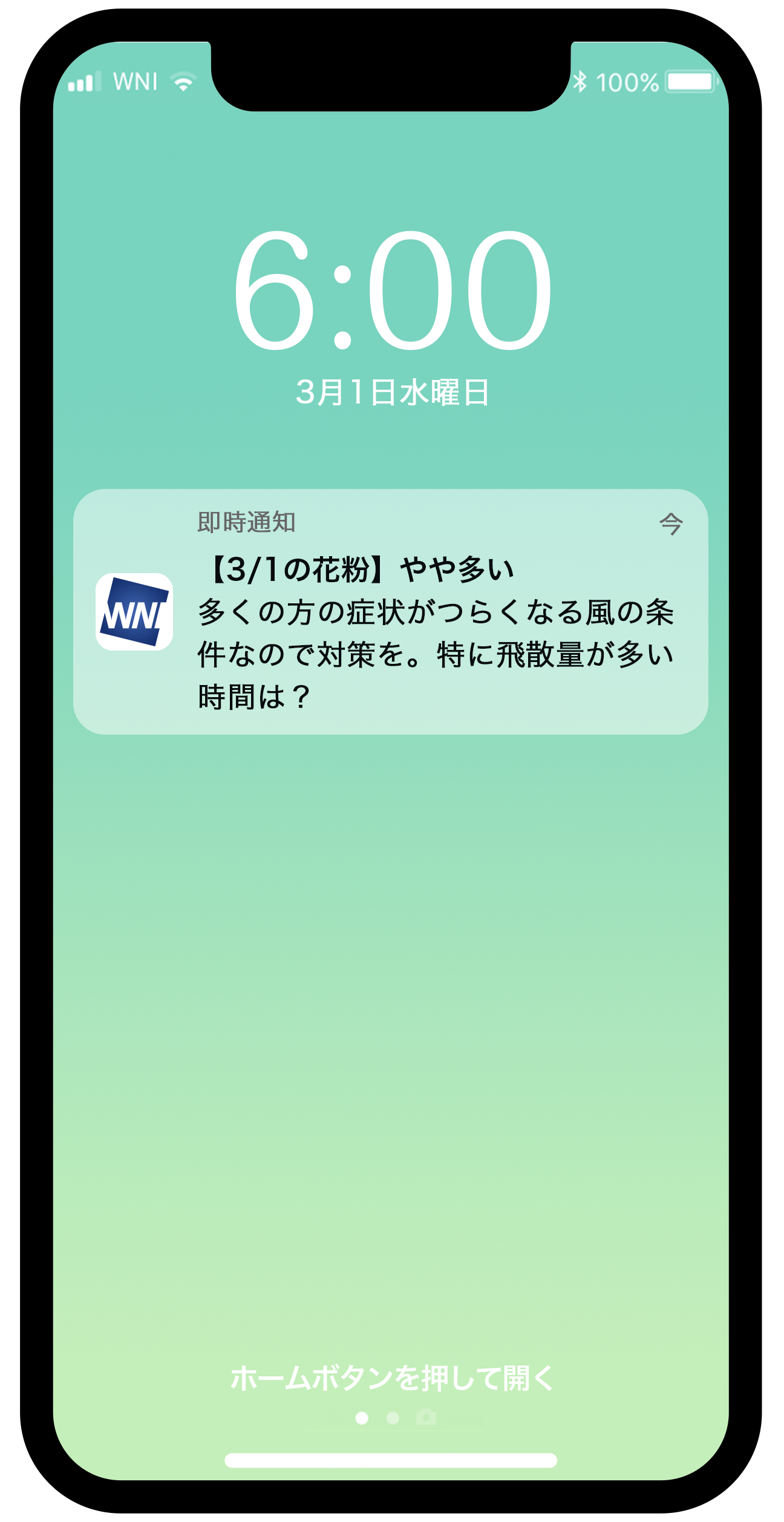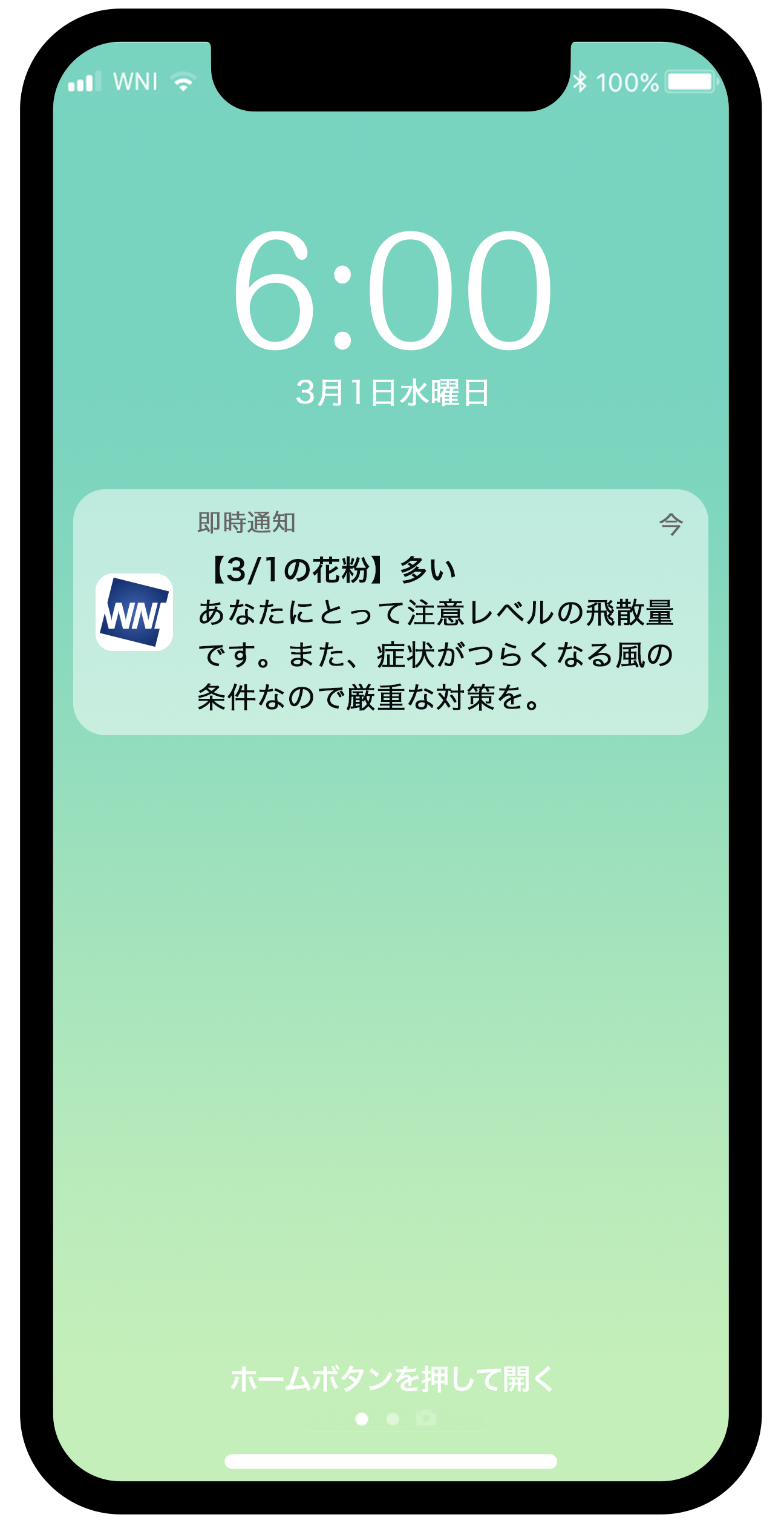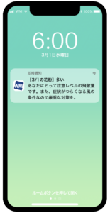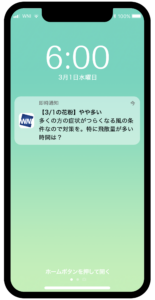 『花粉対策アラーム』は、毎朝6時にその日の花粉予報をプッシュ通知で届ける通知サービスです。シーズンの開始やピークの到来、さらに一時的な「大量飛散」の予兆をいち早く捉え、臨時情報としてお届けします。