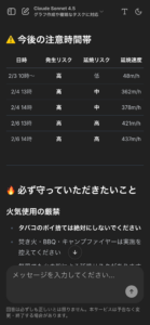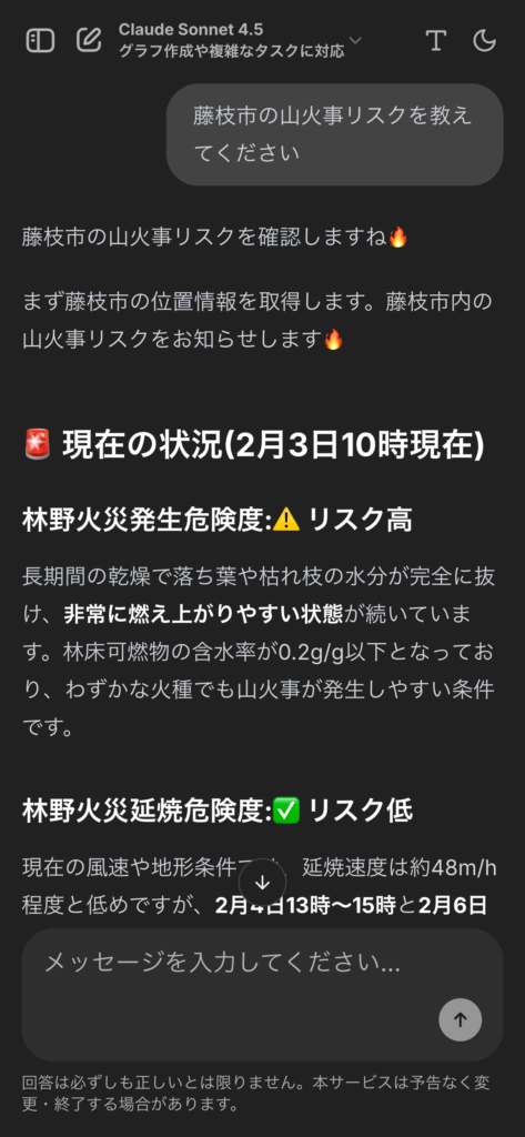 今回のアップデートにより、例えば「近くで山火事の危険はある?」「今日の焚き火は中止すべき?」といった質問に対して、AIが最新の情報をもとに「今日は落葉が非常に乾燥しており、小さな火種でも燃え上がりやすい状態です」などと、具体的な危険性を伝えます。このように単なる数値での回答ではなく、「なぜ危険なのか」「どう行動すべきか」を具体的に伝えるため、専門知識がなくてもリスクを自分ごととして捉え、安全な行動につなげることができます。