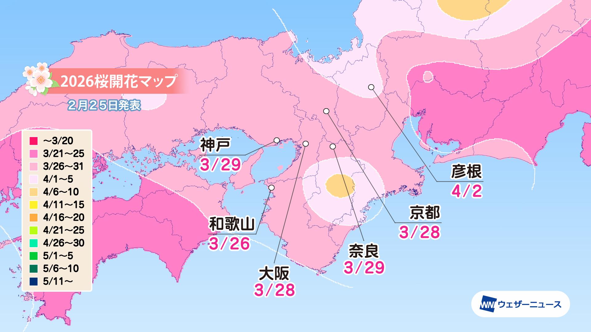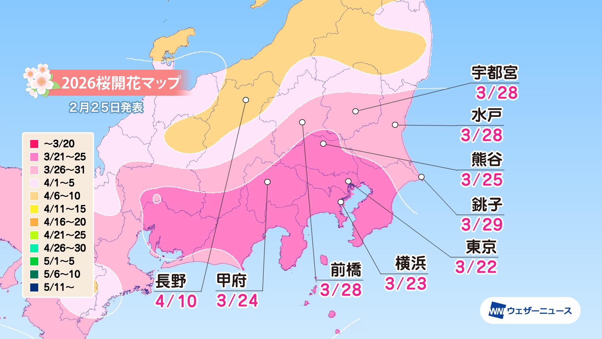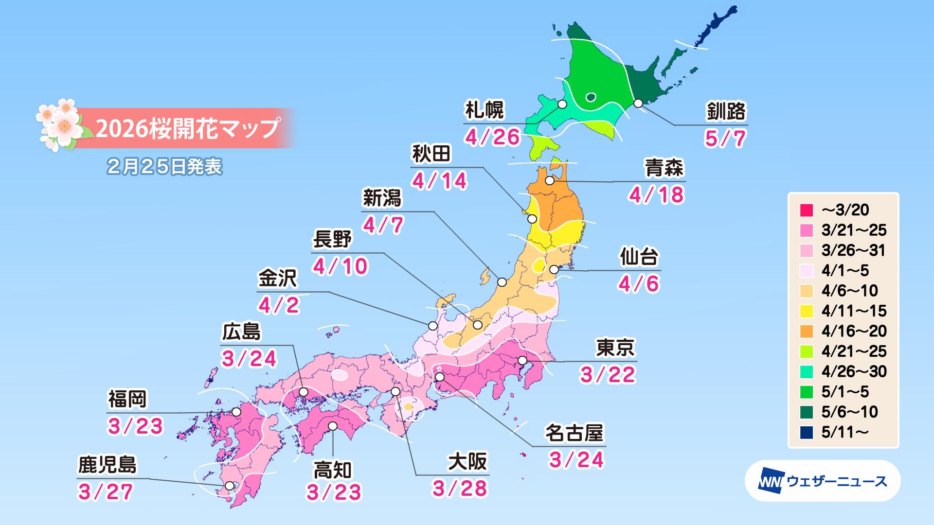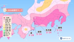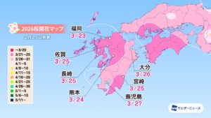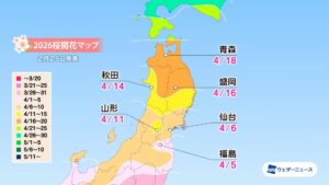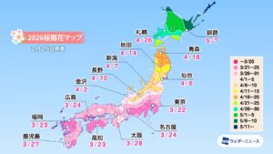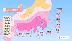 モバイル/インターネット >株式会社ウェザーニューズ(本社:千葉市美浜区、代表取締役社長:石橋 知博)は、2026年シーズンの「第四回桜開花予想」を発表しました。今年の桜(ソメイヨシノ)の開花は、西日本と東日本は平年並、北日本は平年並から非常に早い開花になる予想です。3月22日の東京から全国の桜の開花はスタートし、翌23日には福岡、高知、横浜が続く見込みです。3月中には西日本や東日本の各地で続々と開花を迎え、4月上旬には東北南部でも咲き始めるとみています。4月下旬には北海道に桜前線が上陸する予想となっています。