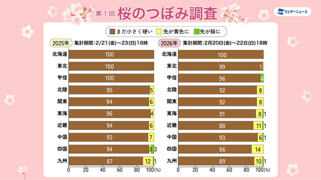 今回より実施している「桜のつぼみ調査」の結果では、全国的に「まだ小さく硬い」つぼみが主流ですが、西日本と東日本では一部で「先が黄色に」変化し始めています。北日本では硬い状態にあるものの、早ければ東北で3月上旬、北海道でも3月下旬からつぼみに変化が現れる見通しです。