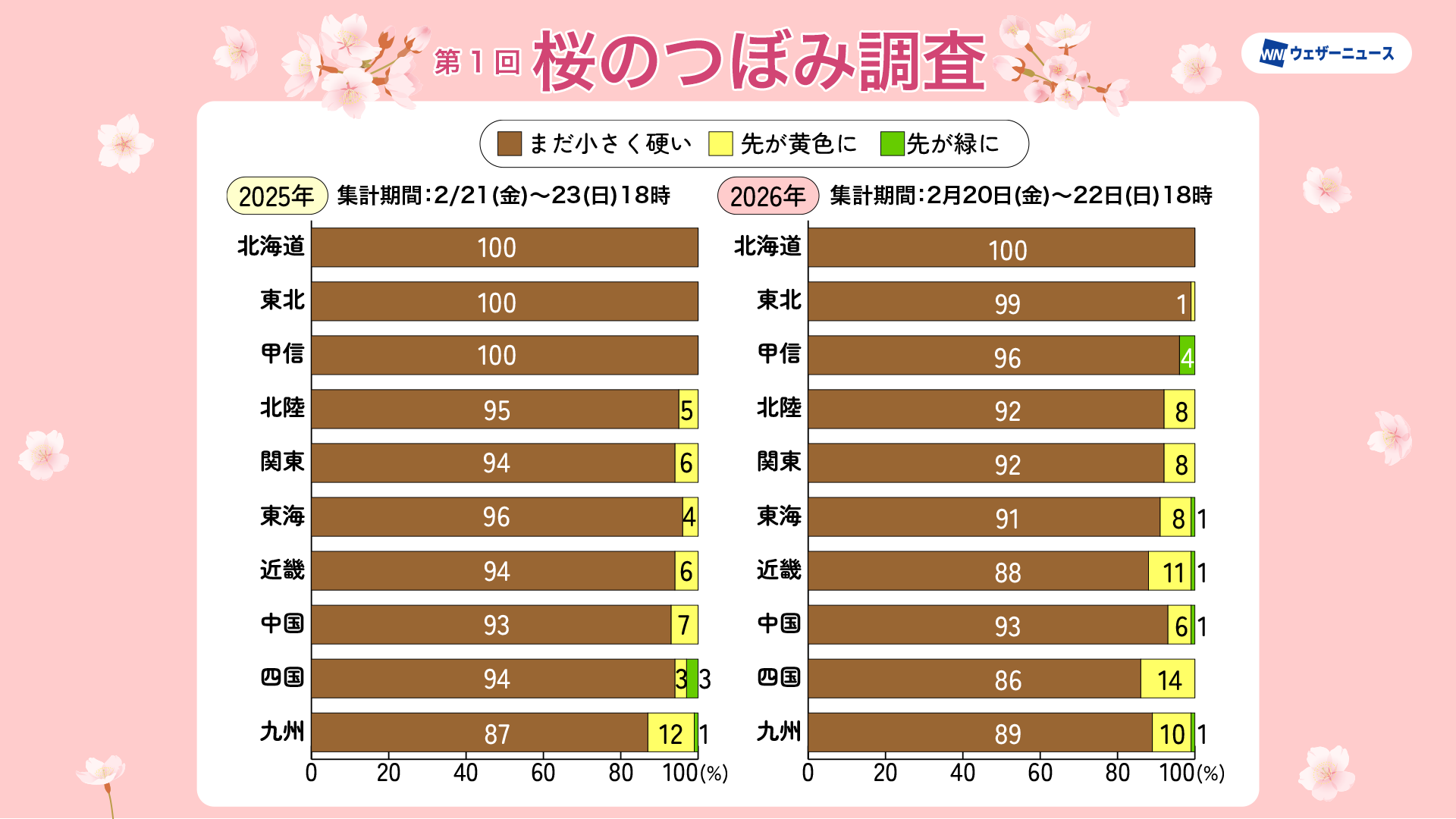 北日本では、ほぼ全てのつぼみが「まだ小さく硬い」状態でした。過去の調査結果を参考にすると、早ければ東北では3月上旬から、北海道では早いところで3月下旬から変化が現れ始めそうです。