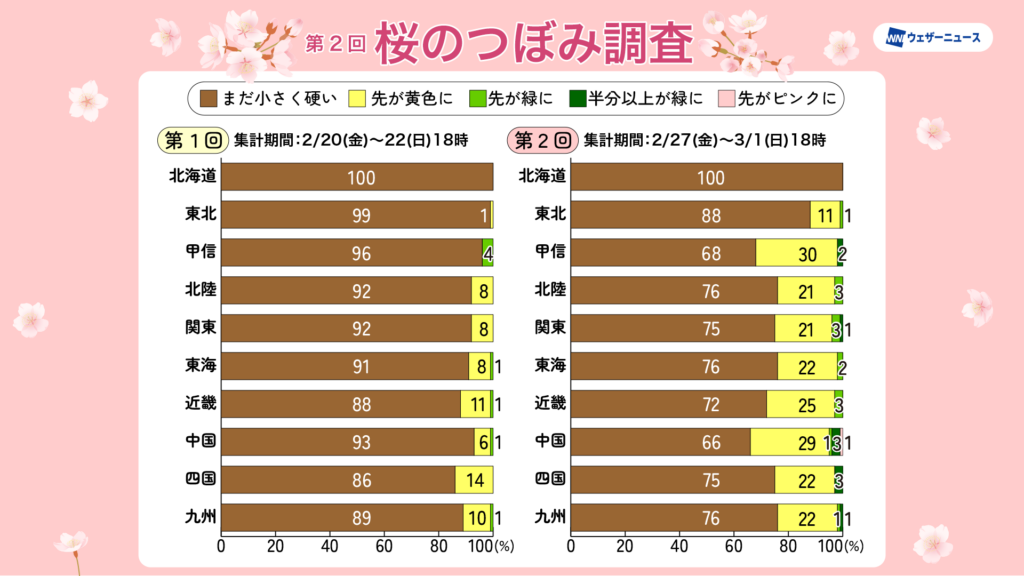 「桜のつぼみ調査」では、「先が黄色に」や「先が緑に」変化したつぼみが全体の24%まで増加しました。つぼみの生長は昨年と同じくらいのペースで進んでいます。この先の天気は周期的に変化しますが、開花直前は晴れる日が多くなり、日差しの暖かさが開花に向けたつぼみの生長を後押しします。