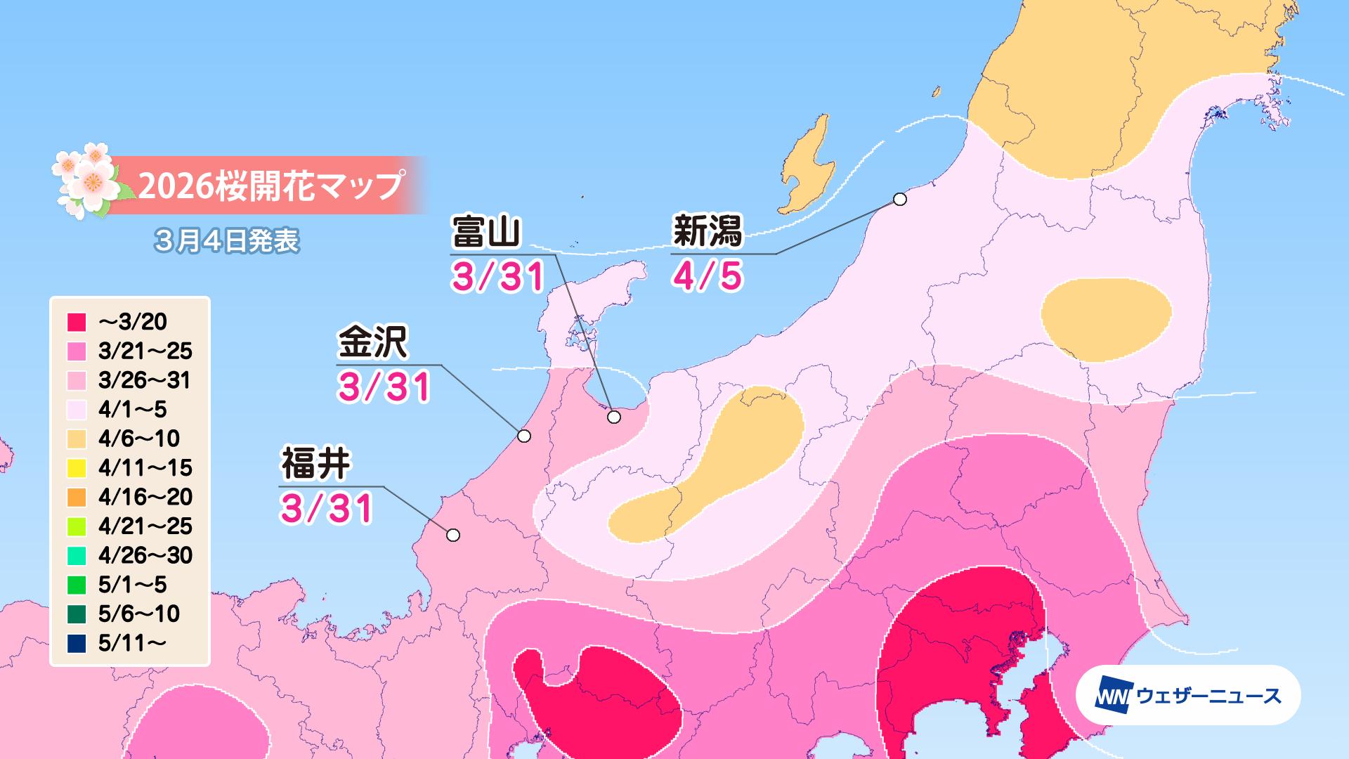 3月31日に福井、金沢、富山で開花し、4月5日に新潟でも開花を迎えます。開花から5日前後で満開を迎え、4月5日に福井、金沢、富山で、10日に新潟で満開となります。満開時期は平年並かやや早い見込みです。特別名勝兼六園(石川県)では3月31日に開花し、4月5日に満開を迎える予想です。