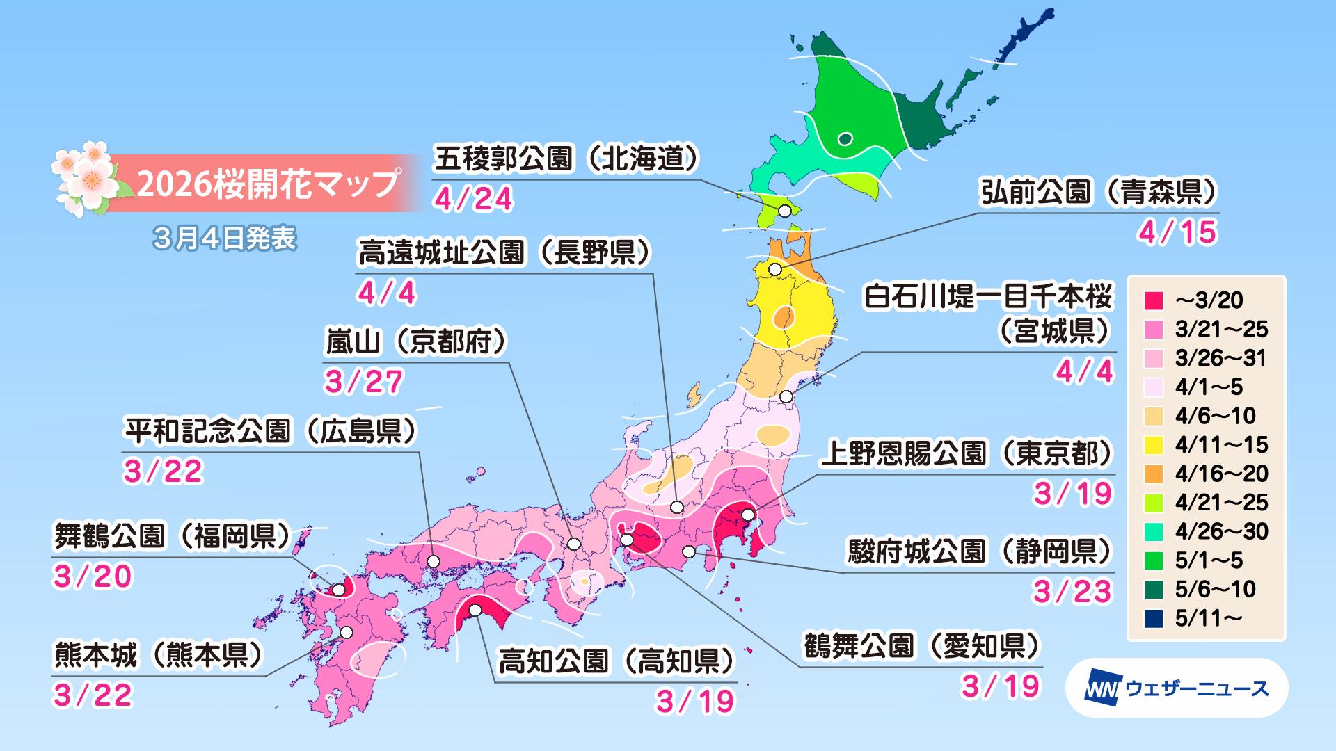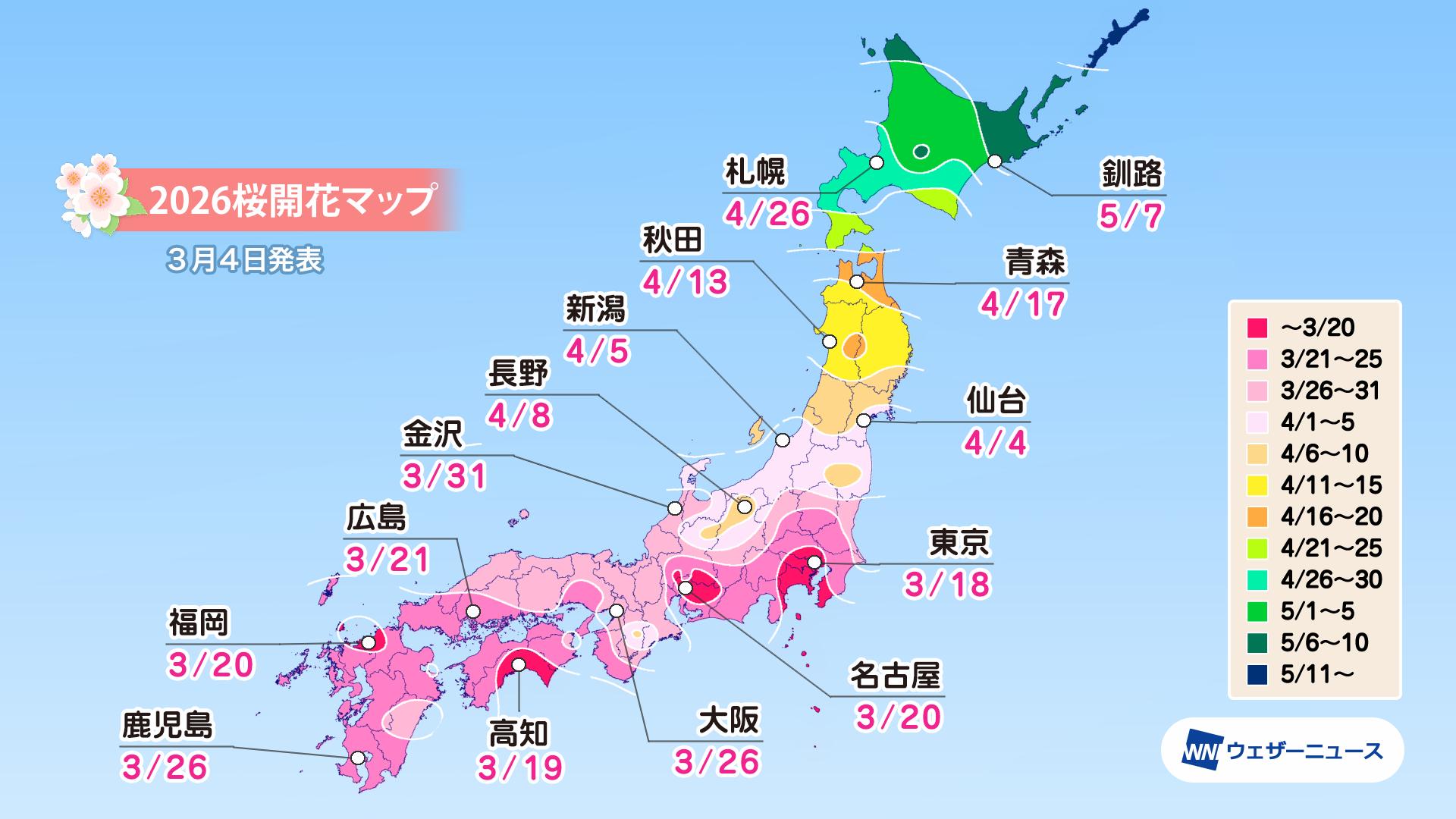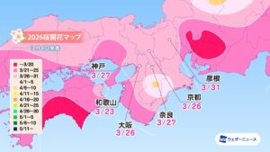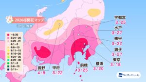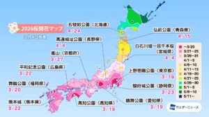 株式会社ウェザーニューズ(本社:千葉市美浜区、代表取締役社長:石橋 知博)は、2026年シーズンの「第五回桜開花予想」を発表しました。今年の桜(ソメイヨシノ)の開花は、西日本と東日本で平年並〜早く、北日本では平年よりやや早い〜非常に早い予想です。開花一番乗りは3月18日の東京で、19日に高知が続きます。3月中に西日本や東日本の各地で開花を迎え、北陸でも3月末に開花します。4月上旬に東北南部でも咲き始め、4月下旬には北海道に桜前線が上陸する予想です。