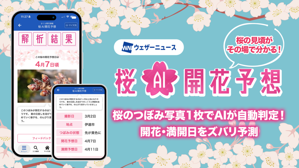 『桜AI開花予想』および「さくら開花情報」は累計5,000万ダウンロードを突破し、予報精度および国内利用者数No.1のお天気アプリ「ウェザーニュース」でご利用いただけます。本アプリは、1kmメッシュのピンポイント天気予報や5分ごとの詳細な気象予報、AIが天気に基づく最適な行動判断を支援するお天気エージェントなどを無料で提供しており、お洗濯情報や服装予報といった日々の生活に役立つ多彩なコンテンツも充実しています。