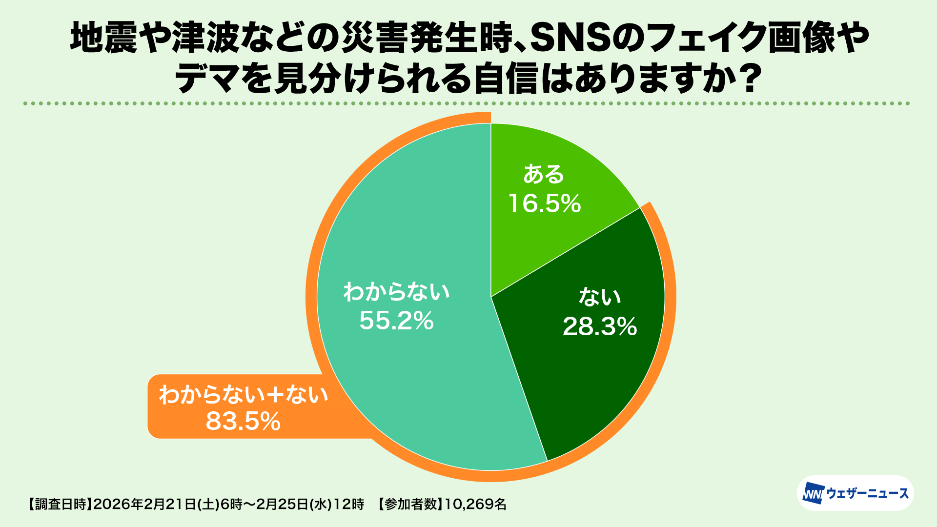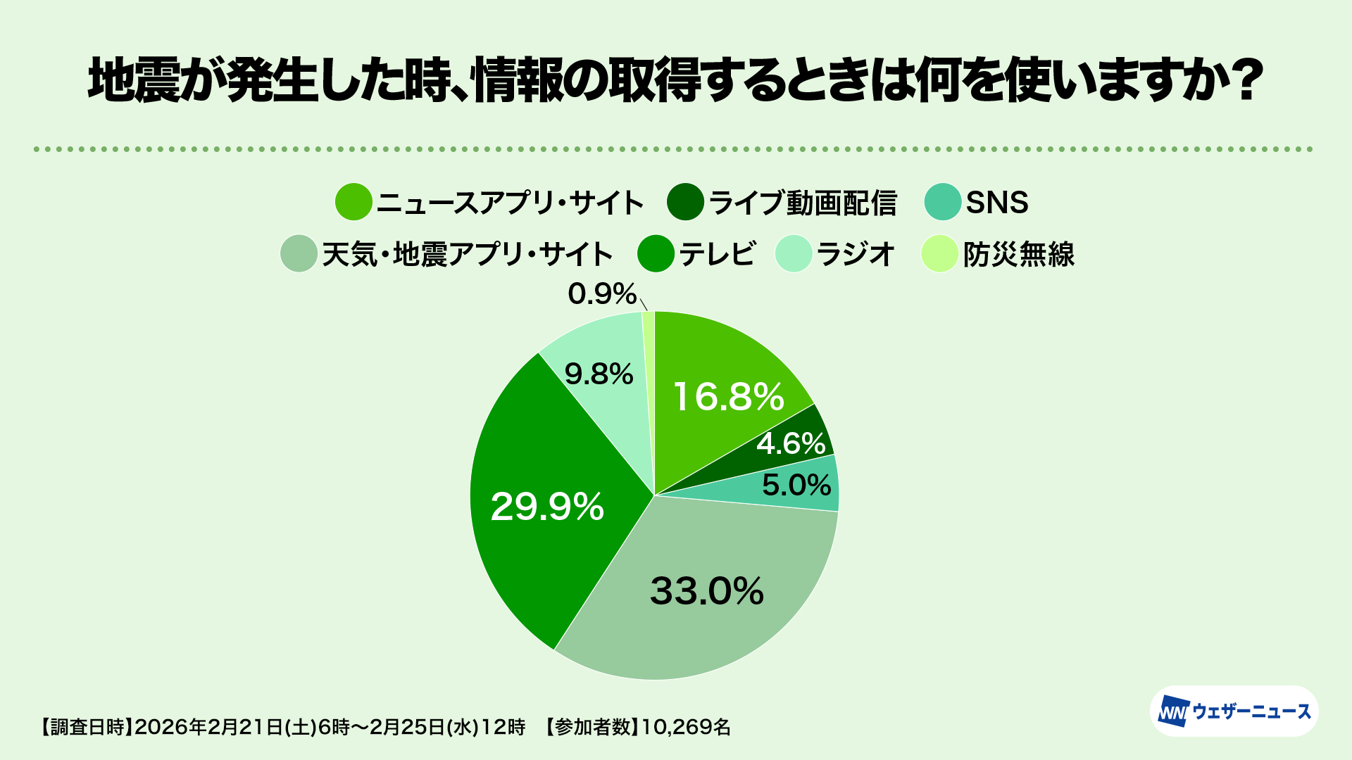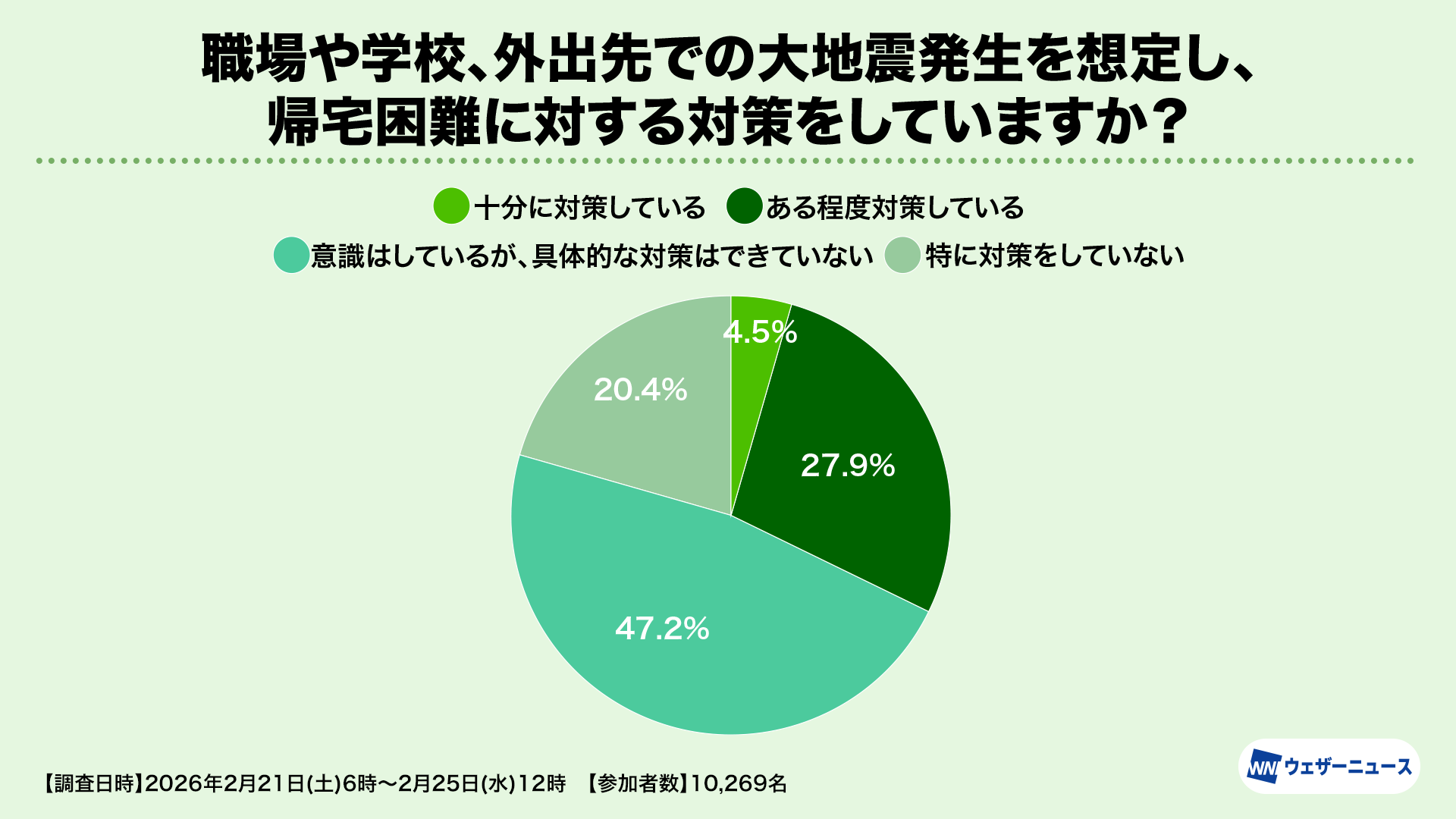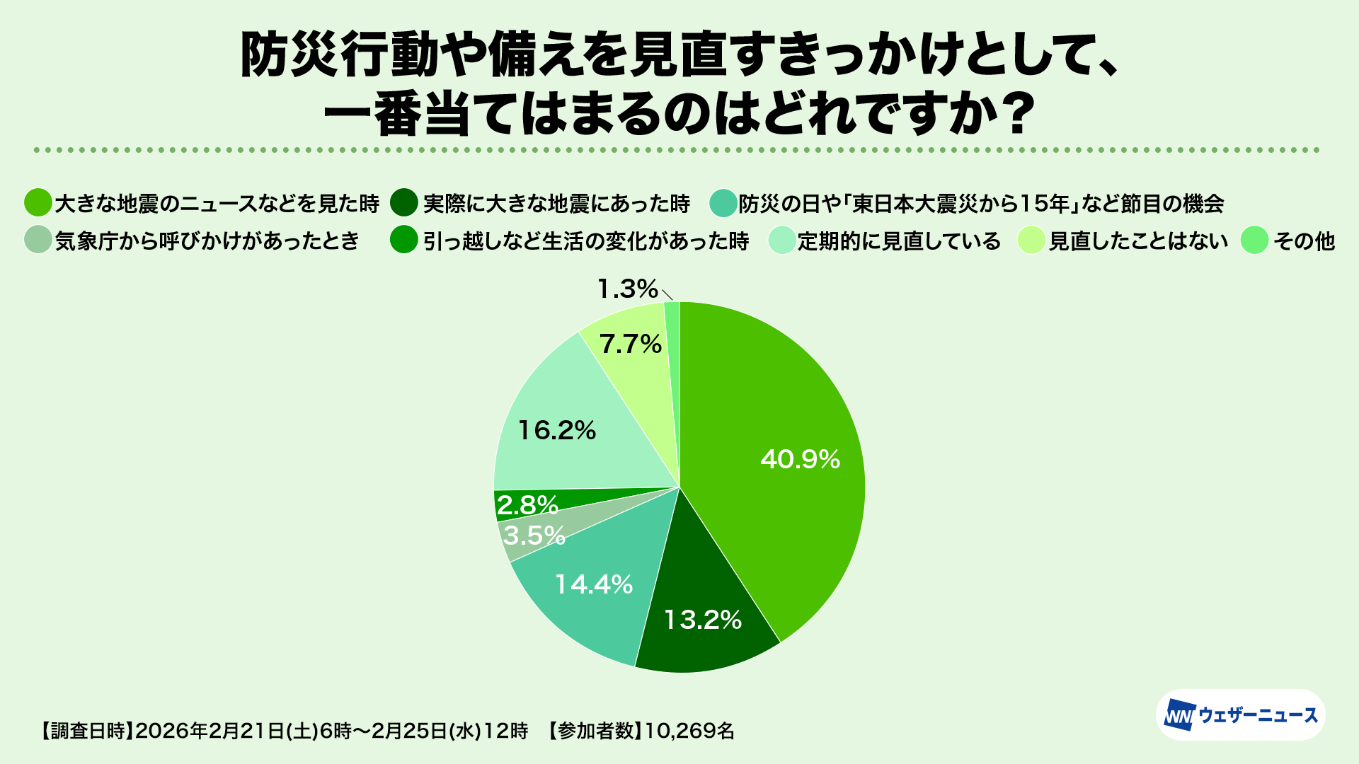 株式会社ウェザーニューズ(本社:千葉市美浜区、代表取締役社長:石橋 知博)は、東日本大震災から15年を迎えるにあたり、いざという時の避難行動や災害対策の一助とすることを目的として、防災・減災への意識の実態や変化を調査する「減災調査2026」を実施し、結果を発表しました。本調査は2月21日から25日にかけてウェザーニュースのアプリやウェブサイトを通じて行い、10,269人にご参加いただきました。