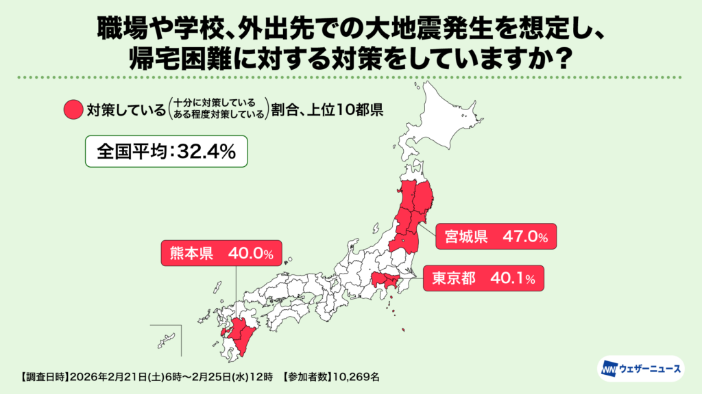 「帰宅困難」への対策率は東京など首都圏や東北、熊本で高い傾向、経験の有無で地域差