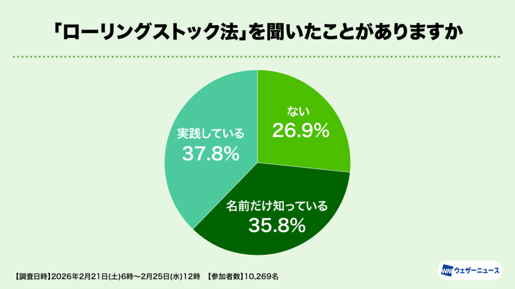 有効な備蓄方法である「ローリングストック」については、実践者が37.8%、認知のみが35.8%と、言葉の認知度は高いものの行動へ移す段階に課題があることがわかりました。