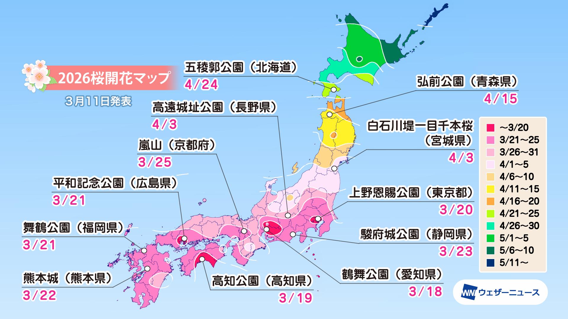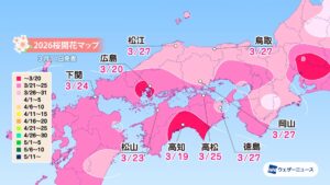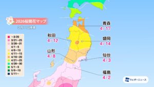 モバイル/インターネット >株式会社ウェザーニューズ(本社:千葉市美浜区、代表取締役社長:石橋 知博)は、「第六回桜開花予想」を発表しました。2026年の桜(ソメイヨシノ)の開花は、西日本と東日本では平年並〜平年より早い、北日本では平年よりやや早い〜非常に早い予想です。