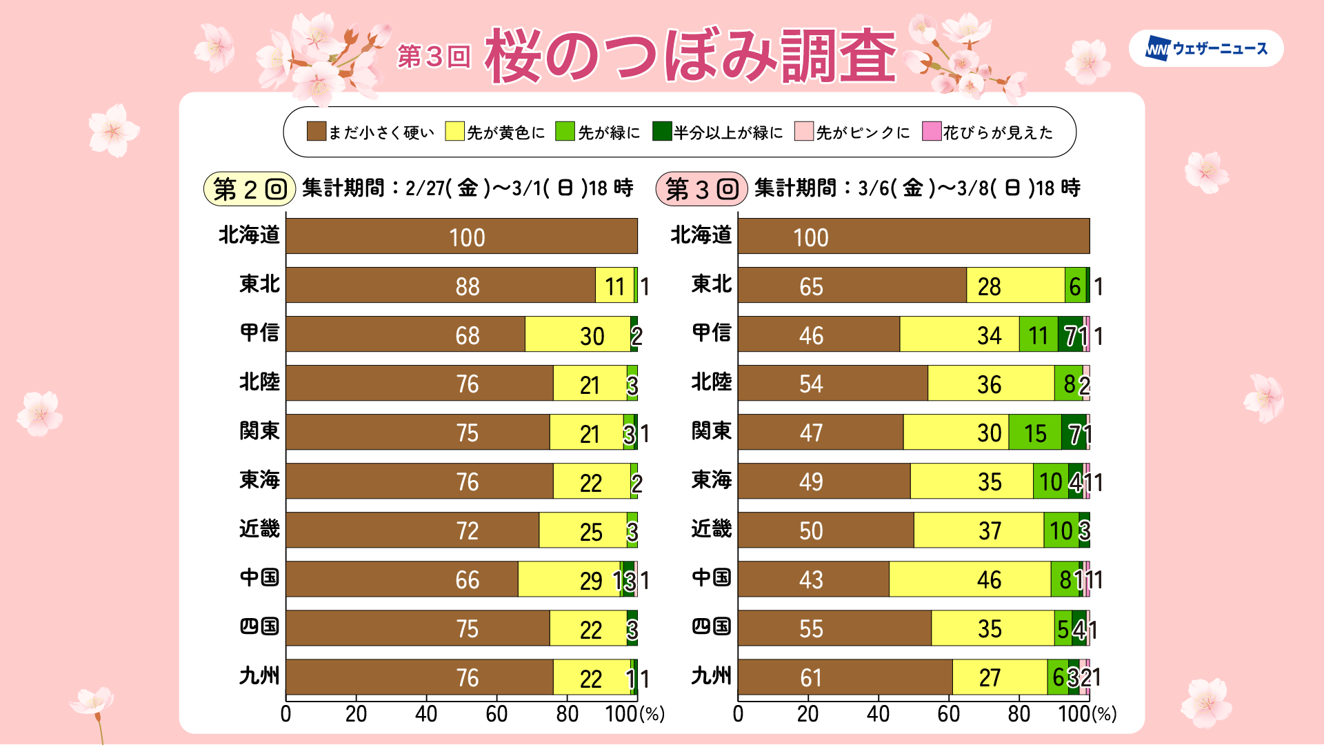 また、東北でも3割以上のつぼみに変化が現れ始めています。一方、北海道ではすべての桜はまだ「小さく硬い」つぼみの状態を維持しており、つぼみに変化が見られるのは、早いところでは3月下旬からの見込みです。