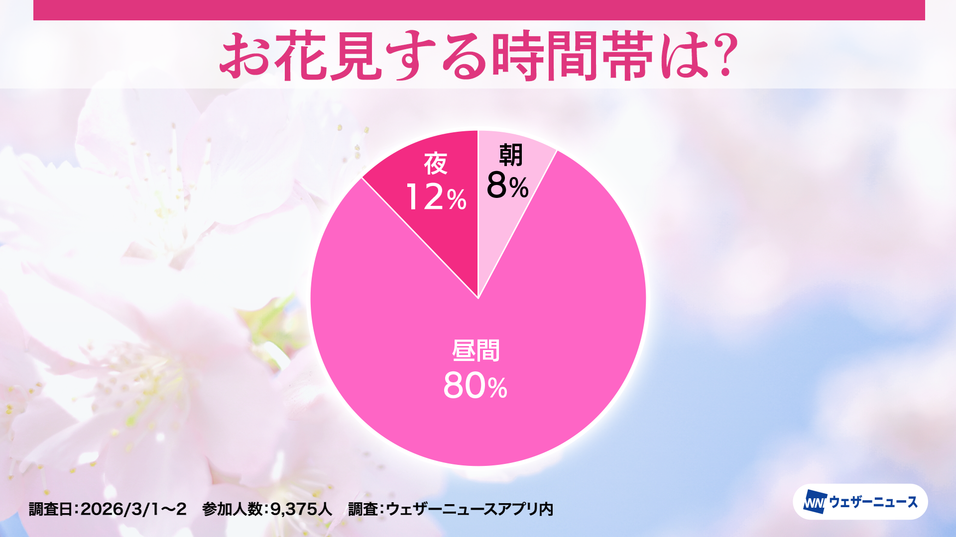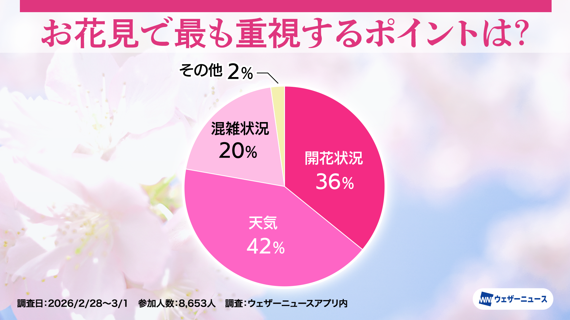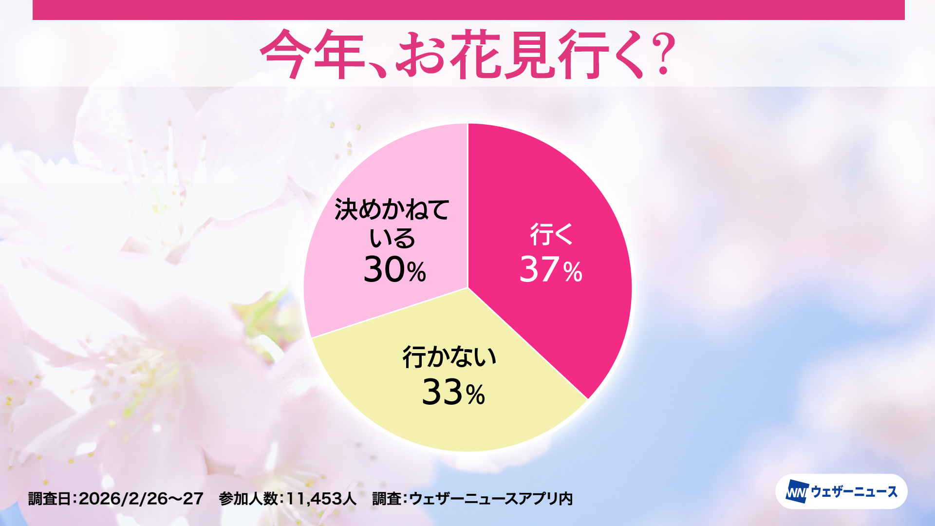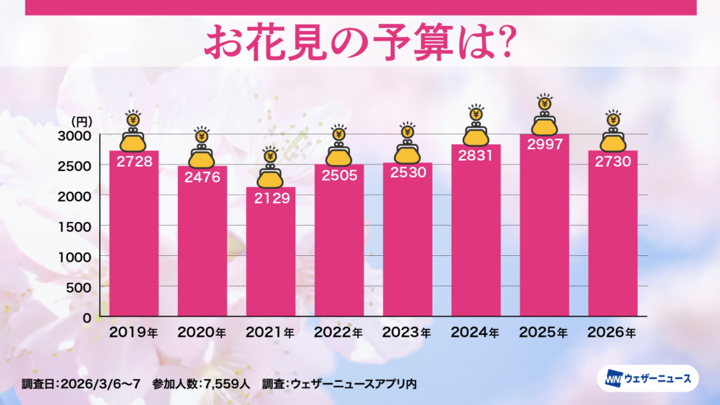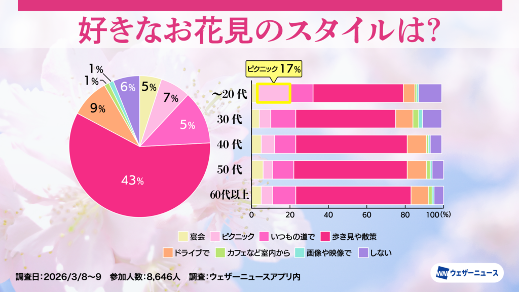 株式会社ウェザーニューズ(本社:千葉市美浜区、代表取締役社長:石橋 知博)は、今年のお花見への意識や人気のお花見スタイルを調査するため、スマホアプリ「ウェザーニュース」を通じて「お花見調査2026」を実施し、その結果を発表しました。
