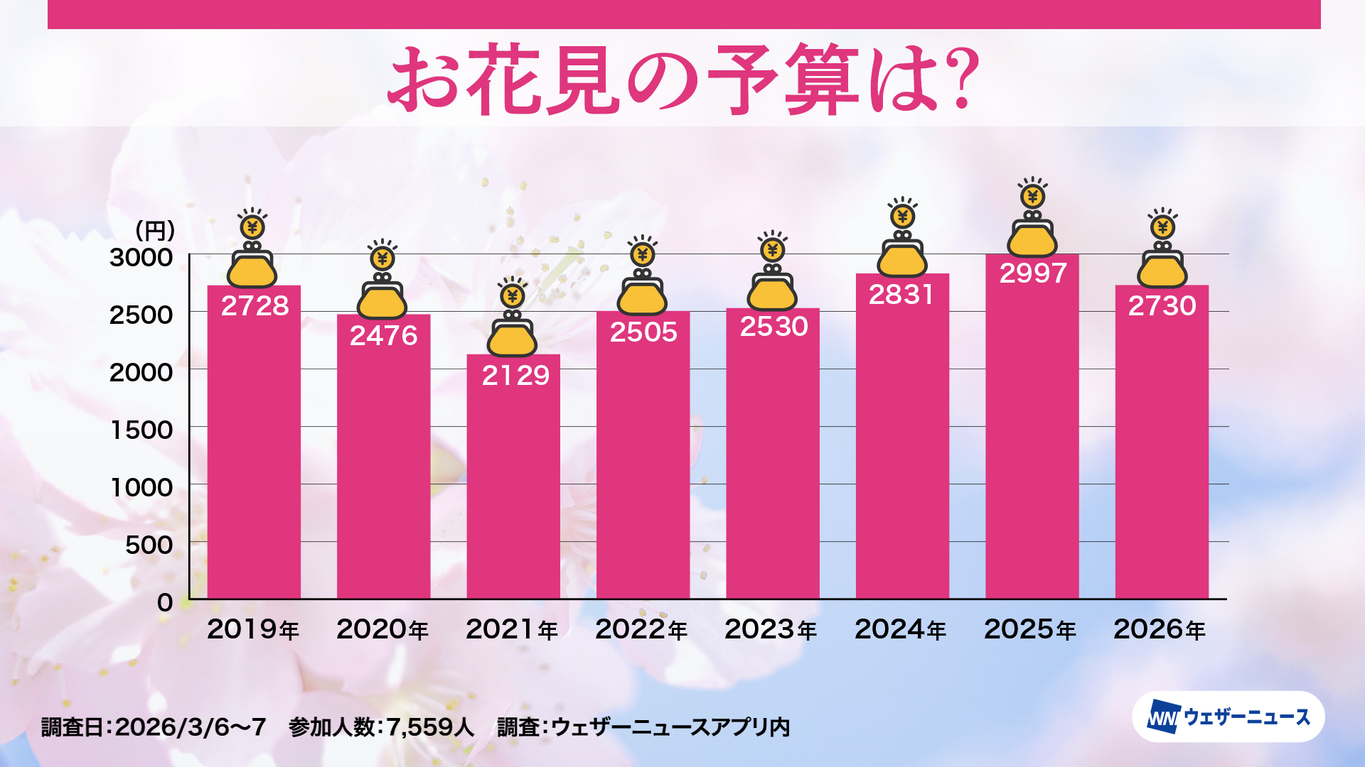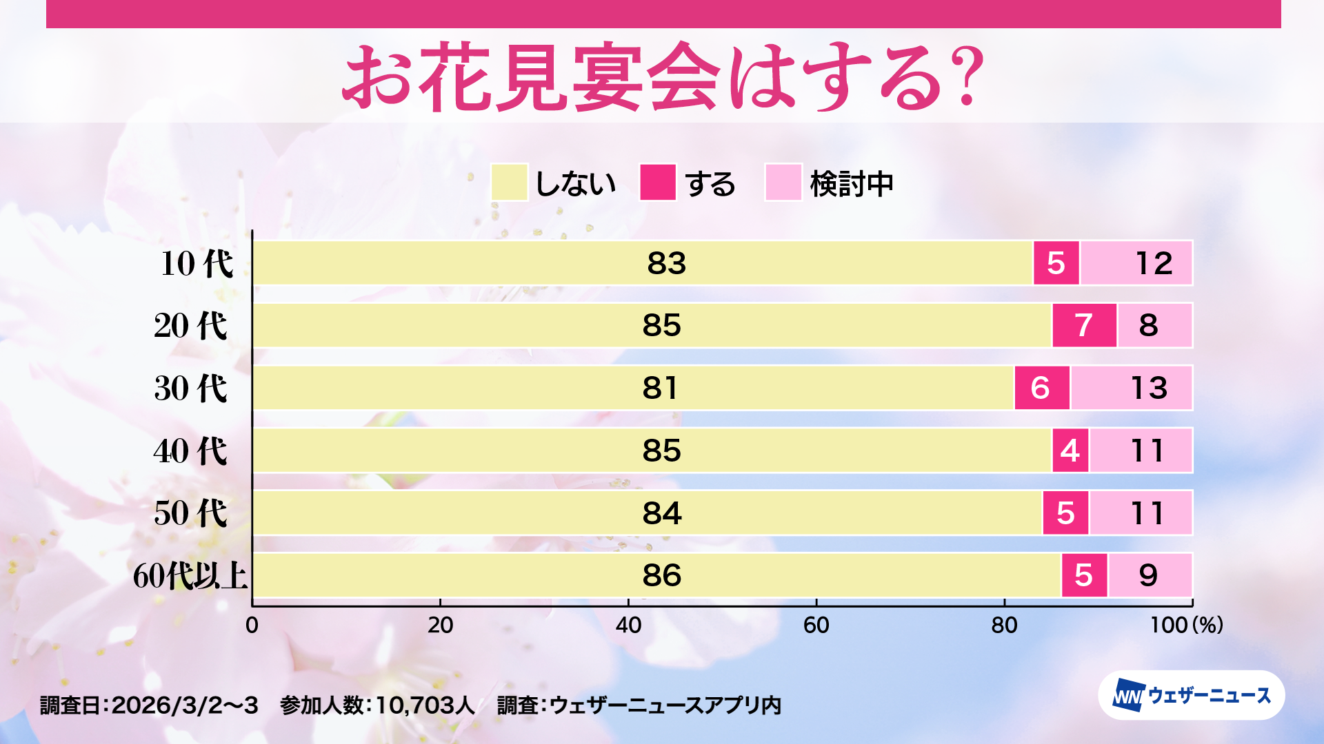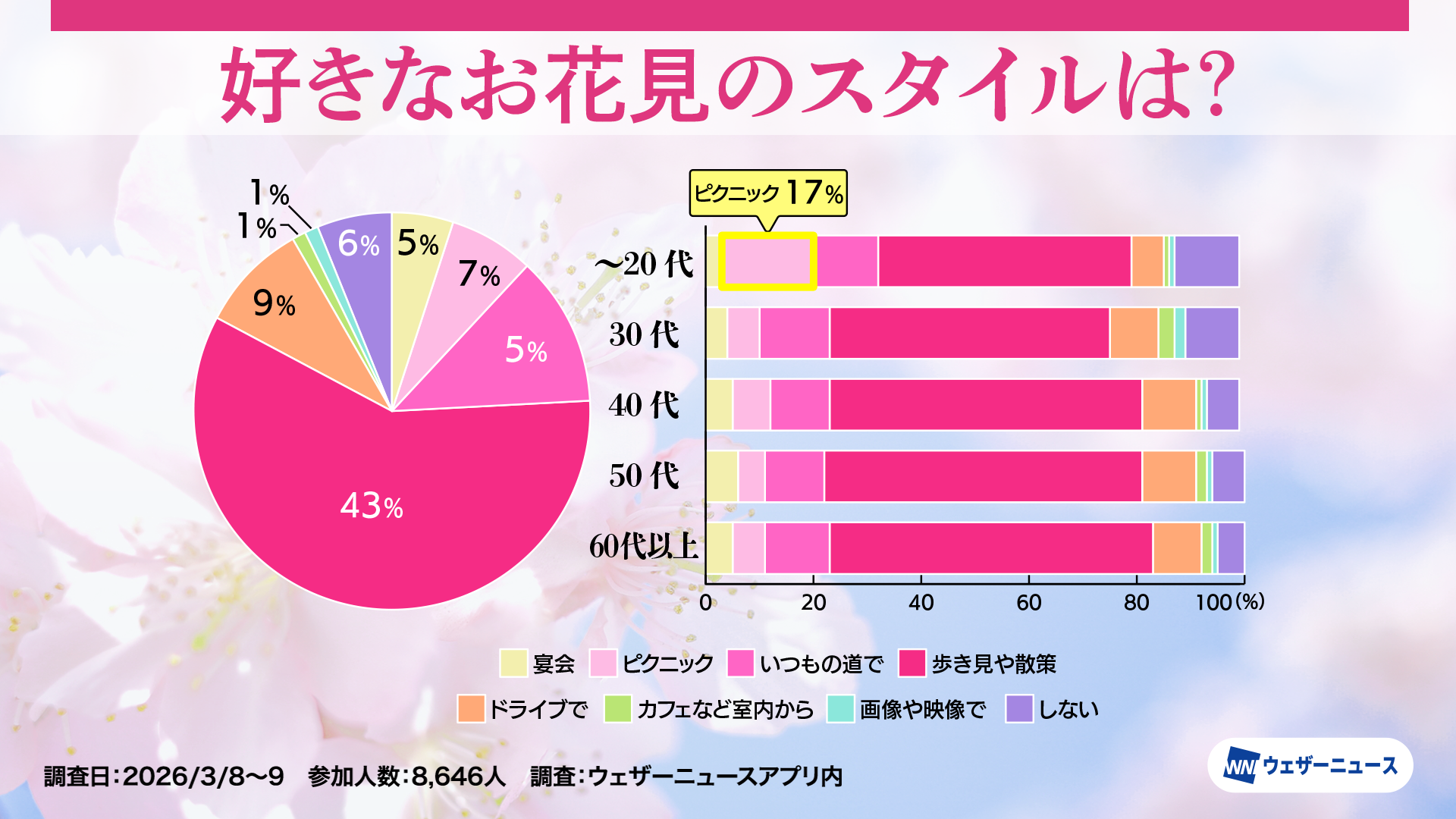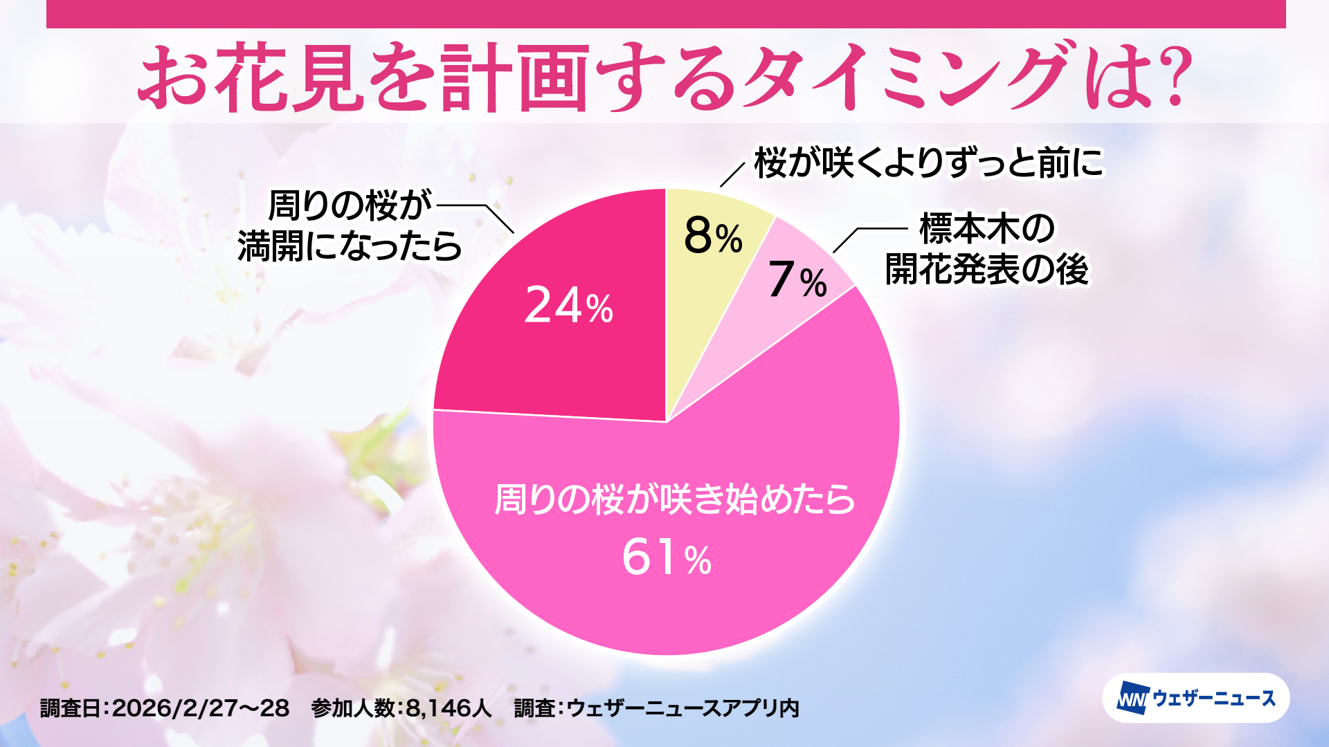 株式会社ウェザーニューズ(本社:千葉市美浜区、代表取締役社長:石橋 知博)は、今年のお花見への意識や人気のお花見スタイルを調査するため、スマホアプリ「ウェザーニュース」を通じて「お花見調査2026」を実施し、その結果を発表しました。