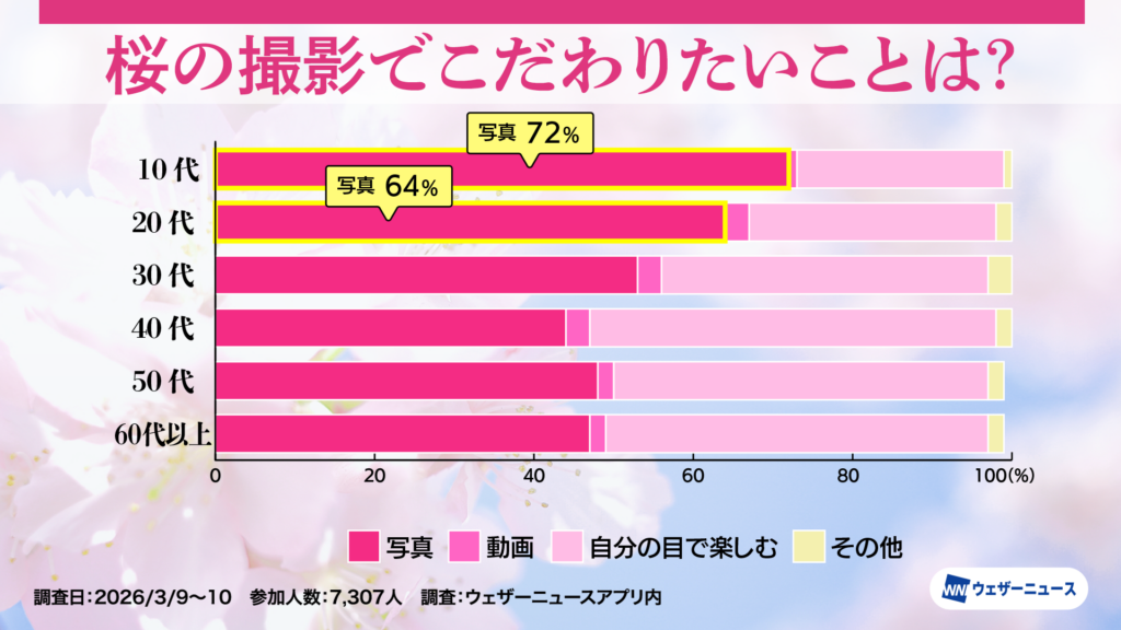 10代の72%、20代の64%が「写真」と回答し、若い世代にとってのお花見は桜の美しさを写真に収め、後から見返したりSNSで共有したりして楽しむことまでがセットになっているのかもしれません。