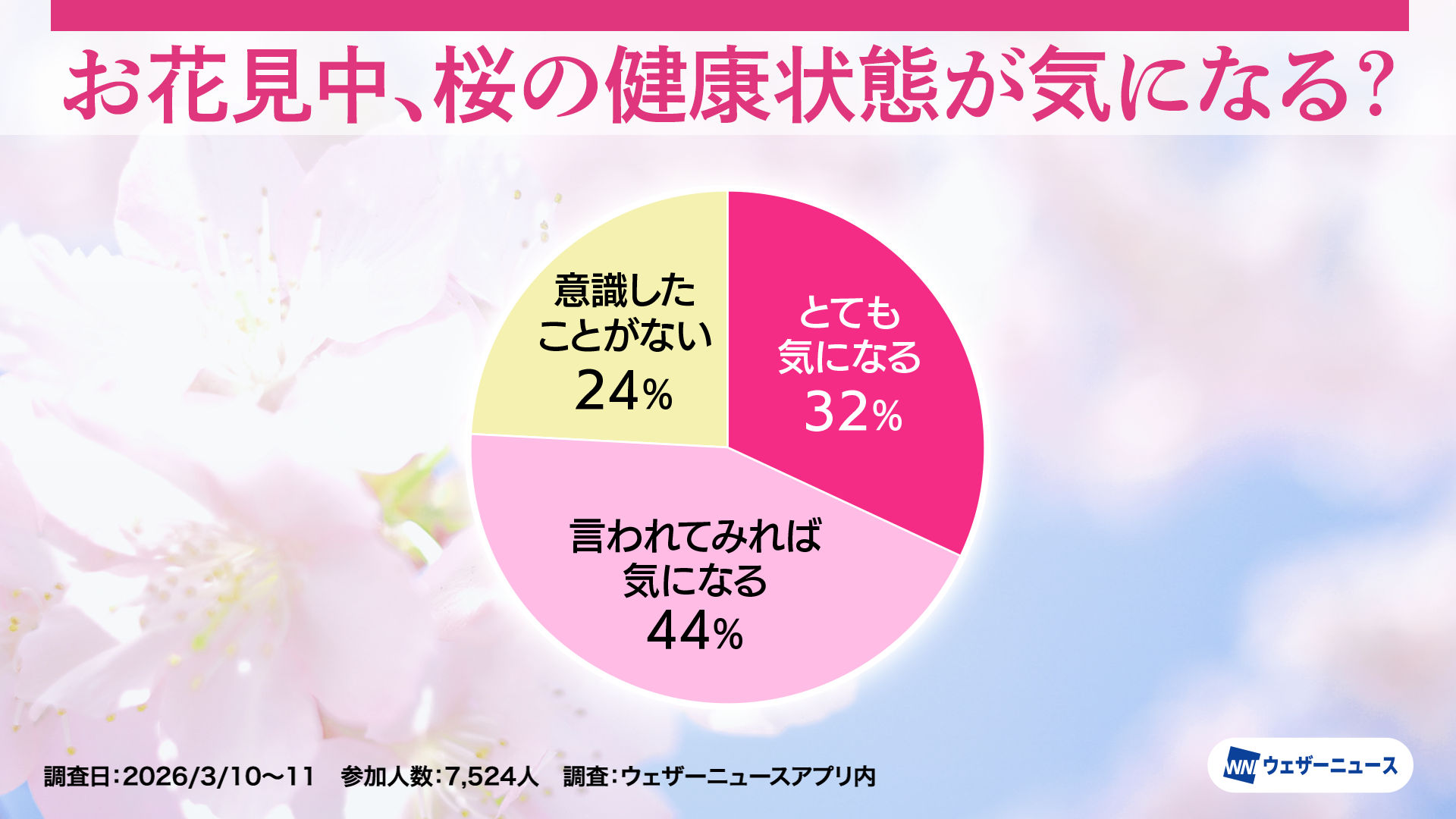 「お花見中、桜の健康状態は気になる?」という問いに対し、「とても気になる」「言われてみれば気になる」「意識したことがない」の3択で回答していただきました(※10)。その結果、「とても気になる」が32%、「言われてみれば気になる」が44%となり、「気になる」と回答した方は全体の7割以上という結果になりました。