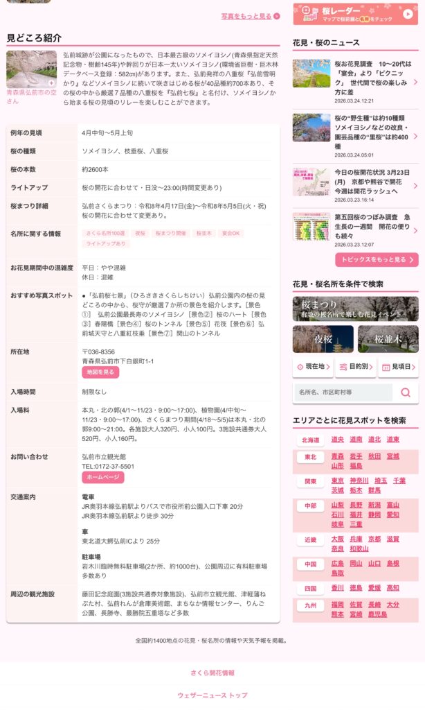 ウェザーニュースの「さくら開花情報」では、全国1,400か所以上の桜の名所について、現在の開花状況や満開予想、アクセス、ライトアップ情報などを確認できます。また、気になる天気の情報もチェックできます。ぜひお花見の計画にお役立てください。