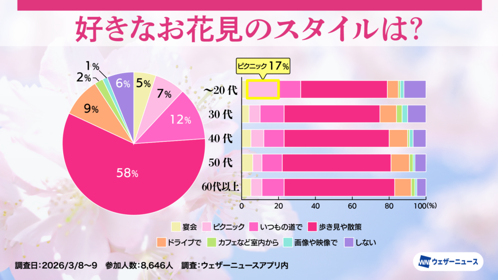 特徴的なのは20代以下の回答です。他の世代では10%に満たない「ピクニック」が、20代以下では17%と高い割合を示しました。30代ではお花見自体を「しない」という選択も増えるなか、若い層ほど友人たちと軽食を持ち寄って桜を楽しむスタイルが支持されているようです。