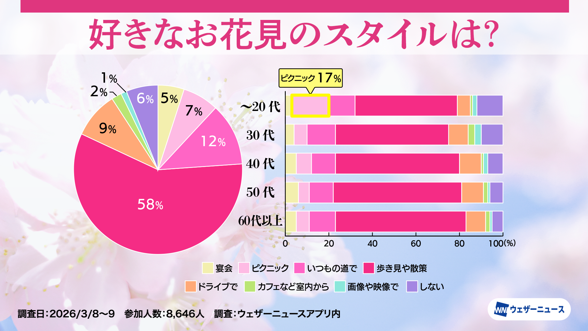 モバイル/インターネット >株式会社ウェザーニューズ(本社:千葉市美浜区、代表取締役社長:石橋 知博)は、今年のお花見への意識や人気のお花見スタイルを調査するため、スマホアプリ「ウェザーニュース」を通じて「お花見調査2026」を実施し、その結果を発表しました。