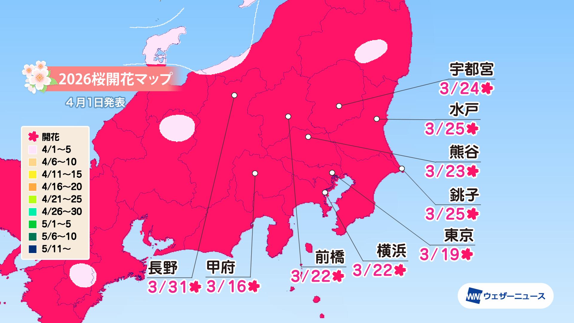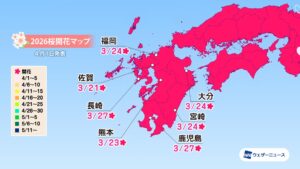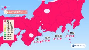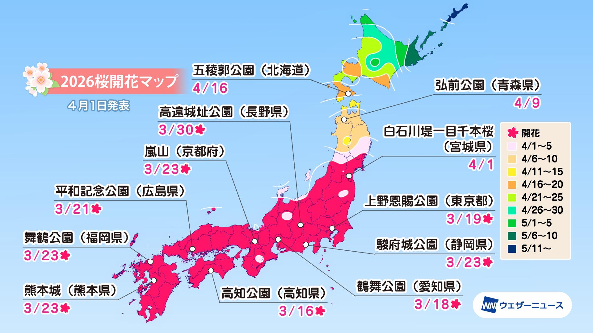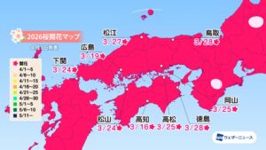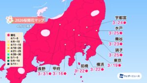 モバイル/インターネット >株式会社ウェザーニューズ(本社:千葉市美浜区、代表取締役社長:石橋 知博)は、「第九回桜開花予想」を発表しました。2026年の桜(ソメイヨシノ)の開花は3月16日に高知や岐阜、甲府からスタートし、17日には名古屋、19日に広島と東京が続きました。西日本と東日本では先週から開花ラッシュとなっており、今週は満開を迎えるところが多くなると予想しています。