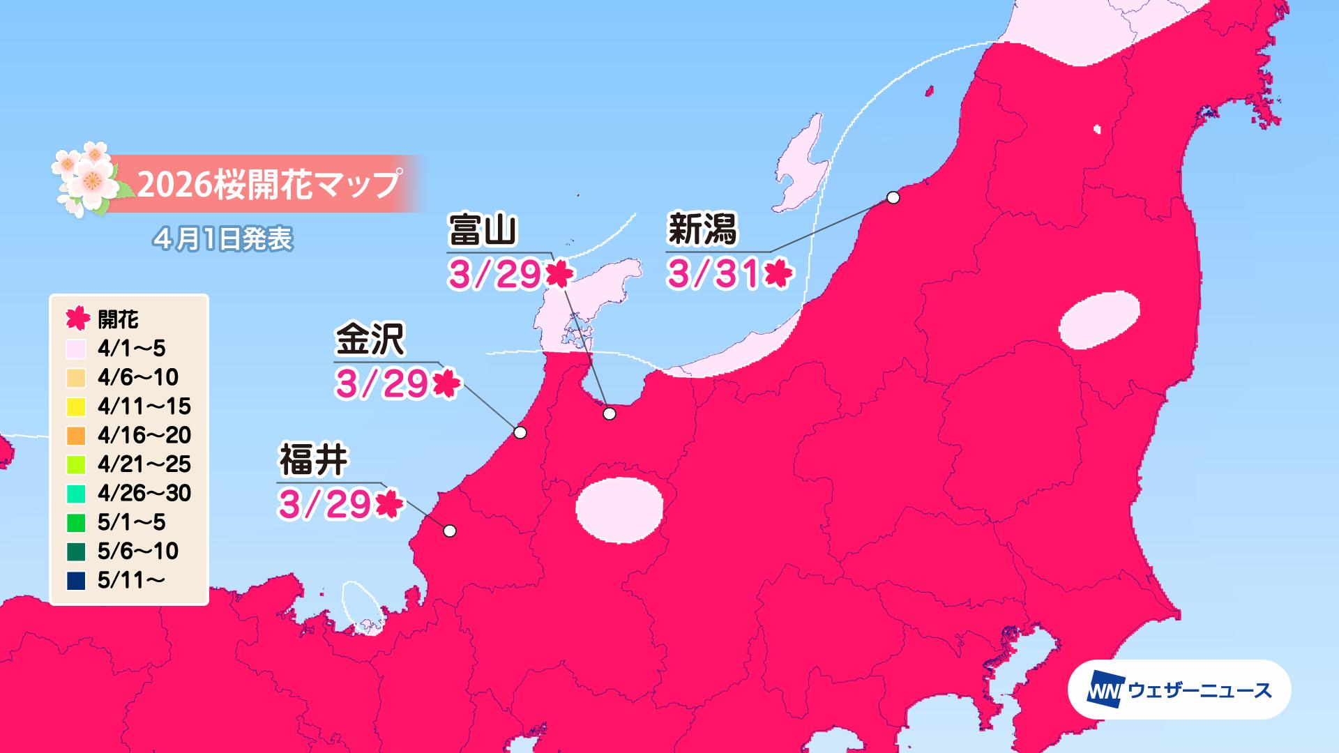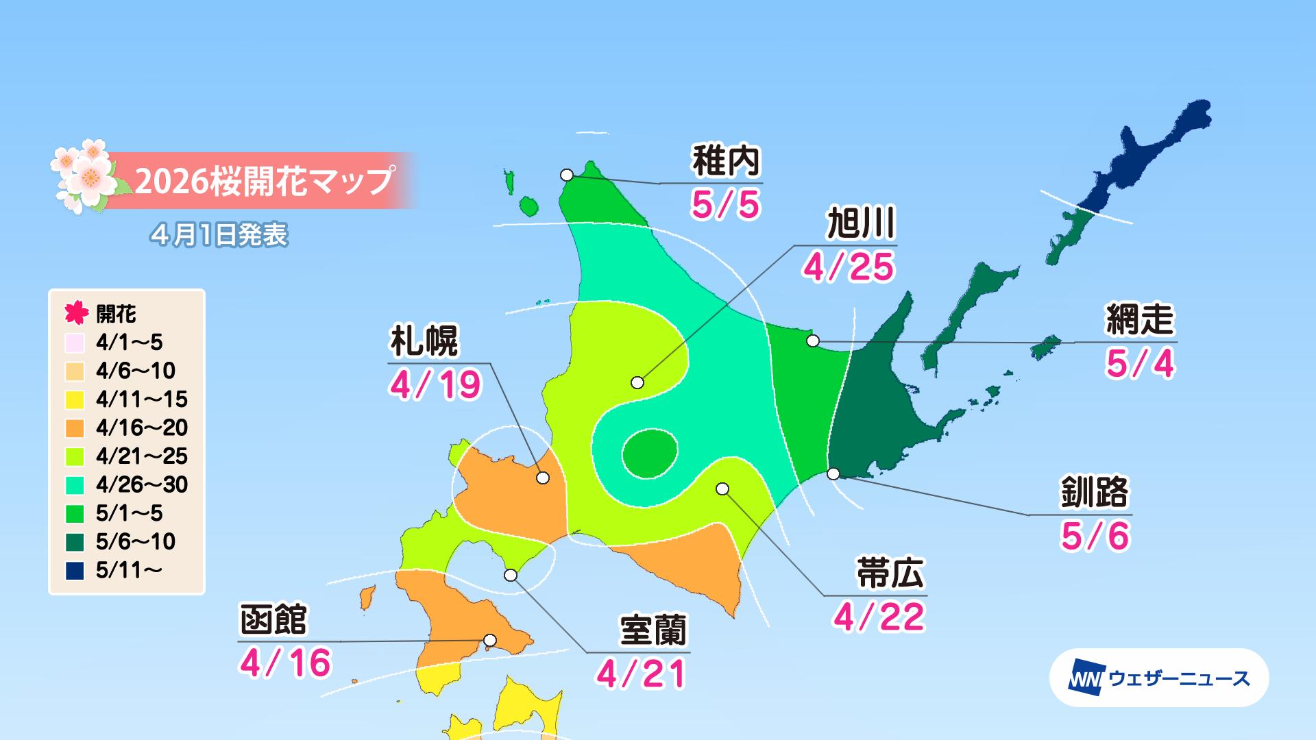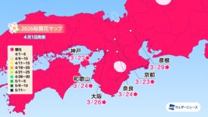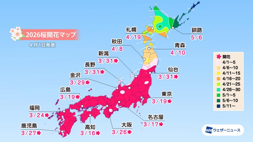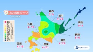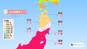2026年の桜の開花は3月16日に高知、岐阜、甲府からスタートしました。17日に名古屋、19日に広島と東京が続き、3月中に西日本や東日本の各地で開花を迎えました。3月29日には福井や金沢、富山、福島などで、31日には長野や新潟、仙台で開花し、桜前線は東北を北上中です。今週末には岩手県の南のエリアで開花し、来週は東北北部の各地で開花、4月中旬には道南や道央でも桜が咲き始め、4月16日に函館から開花し、19日に札幌が続く見込みです。5月上旬にかけては道東と道北でも開花を迎えます。