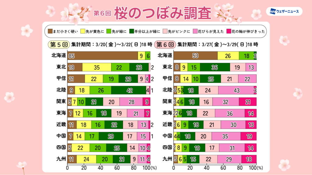 「桜のつぼみ調査」(※)の結果、西日本や東日本では6割以上のつぼみが「先がピンクに」や「花びらが見えた」、「花の軸が伸びきった」など、開花直前の状態まで生長していることがわかりました。北陸でもつぼみの7割が「先がピンクに」以上のランクに変化し、今週中に開花を迎える桜が多くなる見込みです。また、東北でも「先が黄色に」以上に変化したつぼみが9割を超え、南部を中心に「先がピンクに」以上のつぼみが急増するなど、いよいよ多くの桜で開花に向けてカウントダウンが始まりました。北海道では半数近くが「先が黄色に」以上となり、「先が緑に」変化したつぼみも増え、開花に向けて生長が進んでいます。